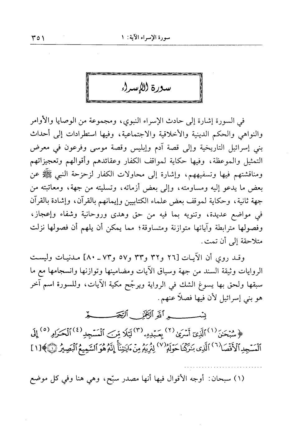 سُبْحانَ الَّذِي أَسْرى بِعَبْدِهِ لَيْلاً مِنَ الْمَسْجِدِ الْحَرامِ إِلَى الْمَسْجِدِ الْأَقْصَى الَّذِي بارَكْنا حَوْلَهُ لِنُرِيَهُ مِنْ آياتِنا إِنَّهُ هُوَ السَّمِيعُ الْبَصِيرُ (1)