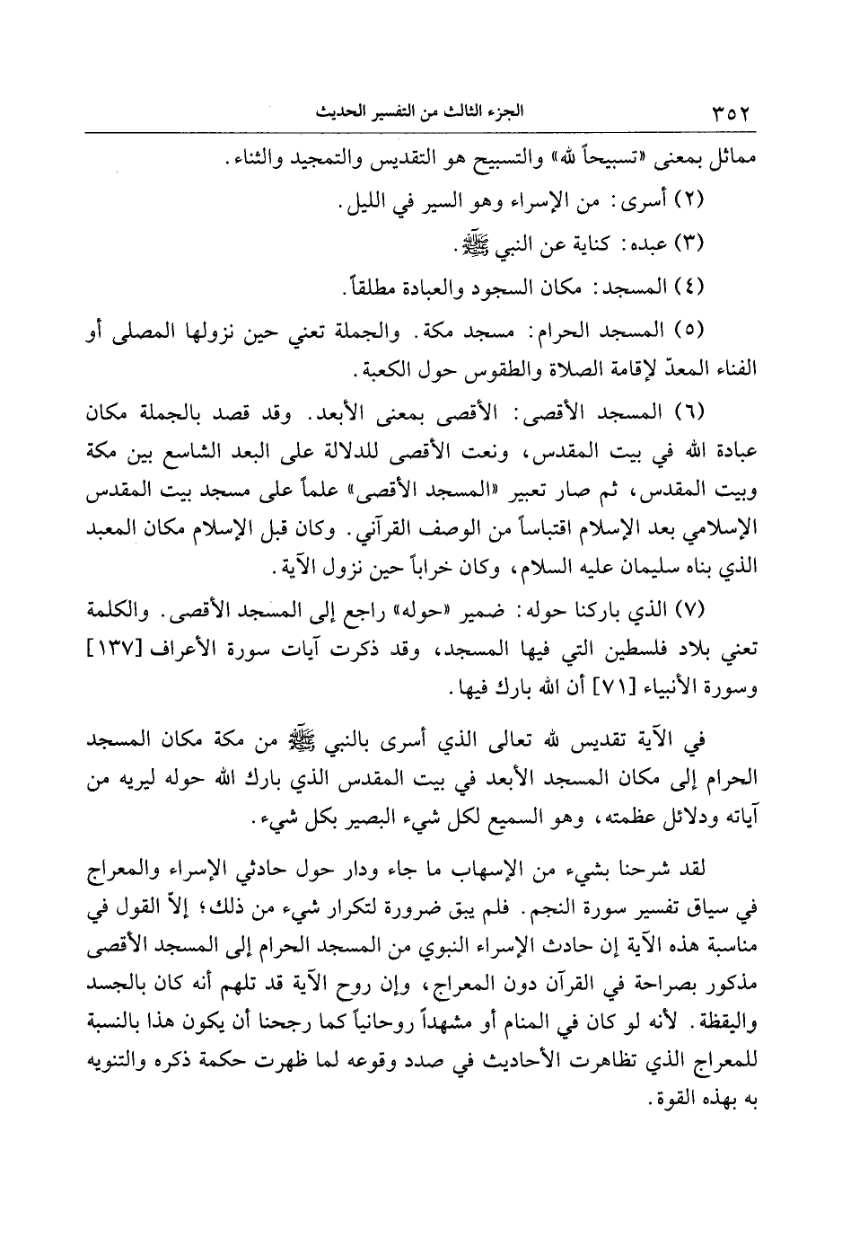 (6) المسجد الأقصى: الأقصى بمعنى الأبعد. وقد قصد بالجملة مكان عبادة الله في بيت المقدس، ونعت الأقصى للدلالة على البعد الشاسع بين مكة وبيت المقدس، ثم صار تعبير «المسجد الأقصى» علما على مسجد بيت المقدس الإسلامي بعد الإسلام اقتباسا من الوصف القرآني. وكان قبل الإسلام مكان المعبد الذي بناه سليمان عليه السلام، وكان خرابا حين نزول الآية.
