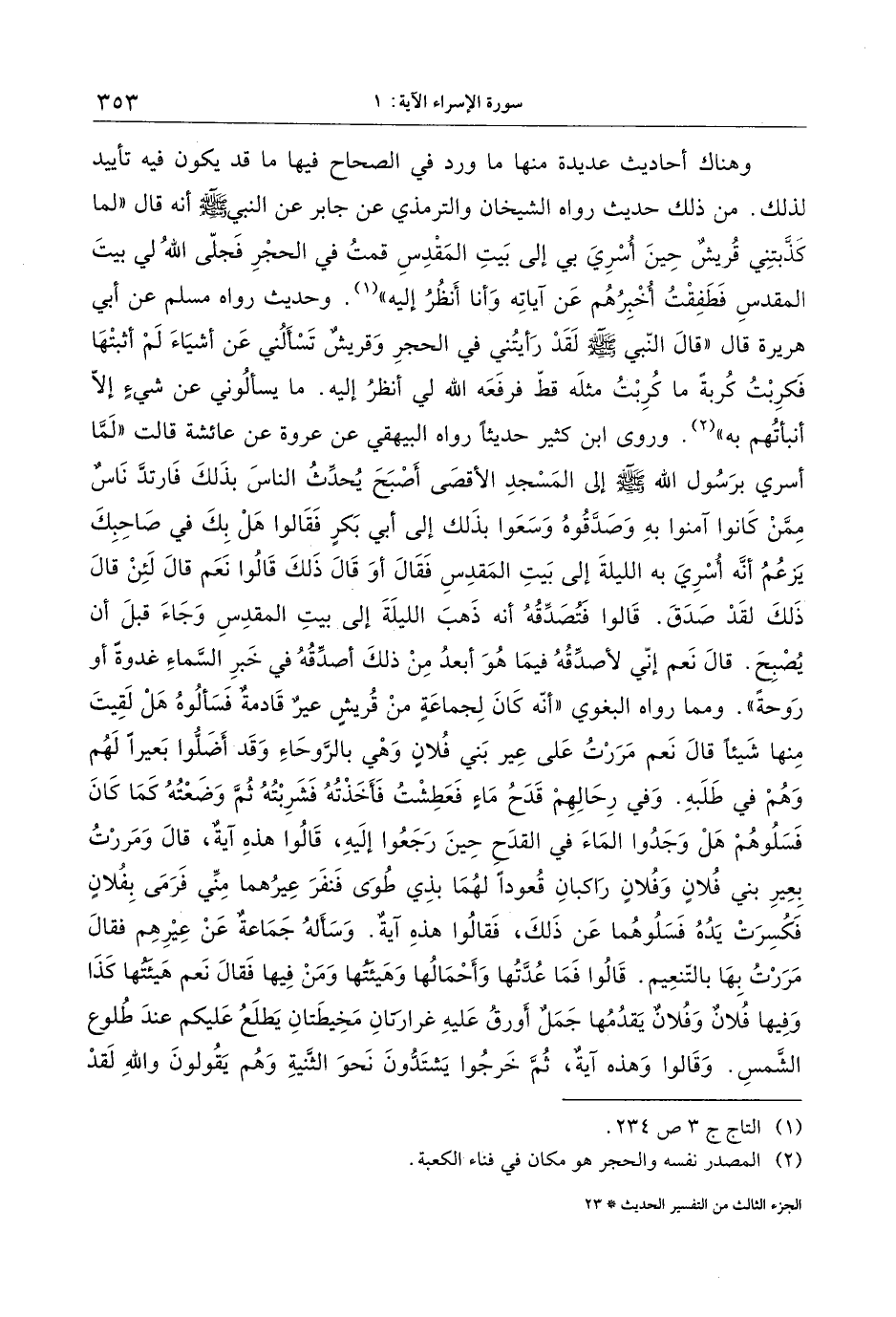 وهناك أحاديث عديدة منها ما ورد في الصحاح فيها ما قد يكون فيه تأييد لذلك. من ذلك حديث رواه الشيخان والترمذي عن جابر عن النبي صلى الله عليه وسلم أنه قال «لما كذّبتني قريش حين أسري بي إلى بيت المقدس قمت في الحجر فجلّى الله لي بيت المقدس فطفقت أخبرهم عن آياته وأنا أنظر إليه» «1» . وحديث رواه مسلم عن أبي هريرة قال «قال النّبي صلى الله عليه وسلم لقد رأيتني في الحجر وقريش تسألني عن أشياء لم أثبتها فكربت كربة ما كربت مثله قطّ فرفعه الله لي أنظر إليه. ما يسألوني عن شيء إلّا أنبأتهم به» «2» . وروى ابن كثير حديثا رواه البيهقي عن عروة عن عائشة قالت «لمّا أسري برسول الله صلى الله عليه وسلم إلى المسجد الأقصى أصبح يحدّث الناس بذلك فارتدّ ناس ممّن كانوا آمنوا به وصدّقوه وسعوا بذلك إلى أبي بكر فقالوا هل بك في صاحبك يزعم أنّه أسري به الليلة إلى بيت المقدس فقال أو قال ذلك قالوا نعم قال لئن قال ذلك لقد صدق. قالوا فتصدّقه أنه ذهب الليلة إلى بيت المقدس وجاء قبل أن يصبح. قال نعم إنّي لأصدّقه فيما هو أبعد من ذلك أصدّقه في خبر السّماء غدوة أو روحة» . ومما رواه البغوي «أنّه كان لجماعة من قريش عير قادمة فسألوه هل لقيت منها شيئا قال نعم مررت على عير بني فلان وهي بالرّوحاء وقد أضلّوا بعيرا لهم وهم في طلبه. وفي رحالهم قدح ماء فعطشت فأخذته فشربته ثمّ وضعته كما كان فسلوهم هل وجدوا الماء في القدح حين رجعوا إليه، قالوا هذه آية، قال ومررت بعير بني فلان وفلان راكبان قعودا لهما بذي طوى فنفر عيرهما منّي فرمى بفلان فكسرت يده فسلوهما عن ذلك، فقالوا هذه آية. وسأله جماعة عن عيرهم فقال مررت بها بالتّنعيم. قالوا فما عدّتها وأحمالها وهيئتها ومن فيها فقال نعم هيئتها كذا وفيها فلان وفلان يقدمها جمل أورق عليه غرارتان مخيطتان يطلع عليكم عند طلوع الشّمس. وقالوا وهذه آية، ثمّ خرجوا يشتدّون نحو الثّنية وهم يقولون والله لقد