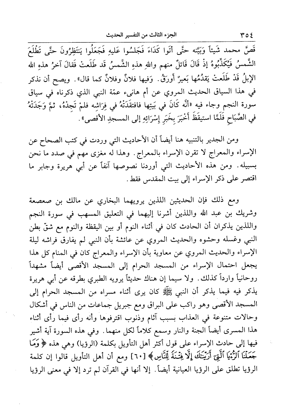 قصّ محمد شيئا وبيّنه حتّى أتوا كداء فجلسوا عليه فجعلوا ينتظرون حتّى تطلع الشّمس فيكذّبوه إذ قال قائل منهم والله هذه الشّمس قد طلعت فقال آخر هذه الله الإبل قد طلعت يقدمها بعير أورق. وفيها فلان وفلان كما قال» . ويصح أن نذكر في هذا السياق والحديث المروي عن أم هانئ عمّة النبي الذي ذكرناه في سياق سورة النجم وجاء فيه «أنّه كان في بيتها فافتقدته في فراشه فلم تجده، ثمّ وجدته في الصّباح فلمّا استيقظ أخبر بخبر إسرائه إلى المسجد الأقصى» .