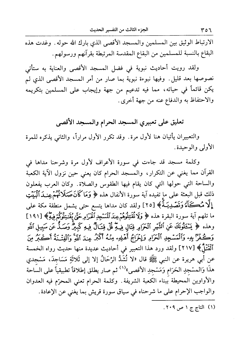 الارتباط الوثيق بين المسلمين والمسجد الأقصى الذي بارك الله حوله. وغدت هذه البقاع بالنسبة للمسلمين من البقاع المقدسة المرتبطة بقرآنهم ورسولهم.