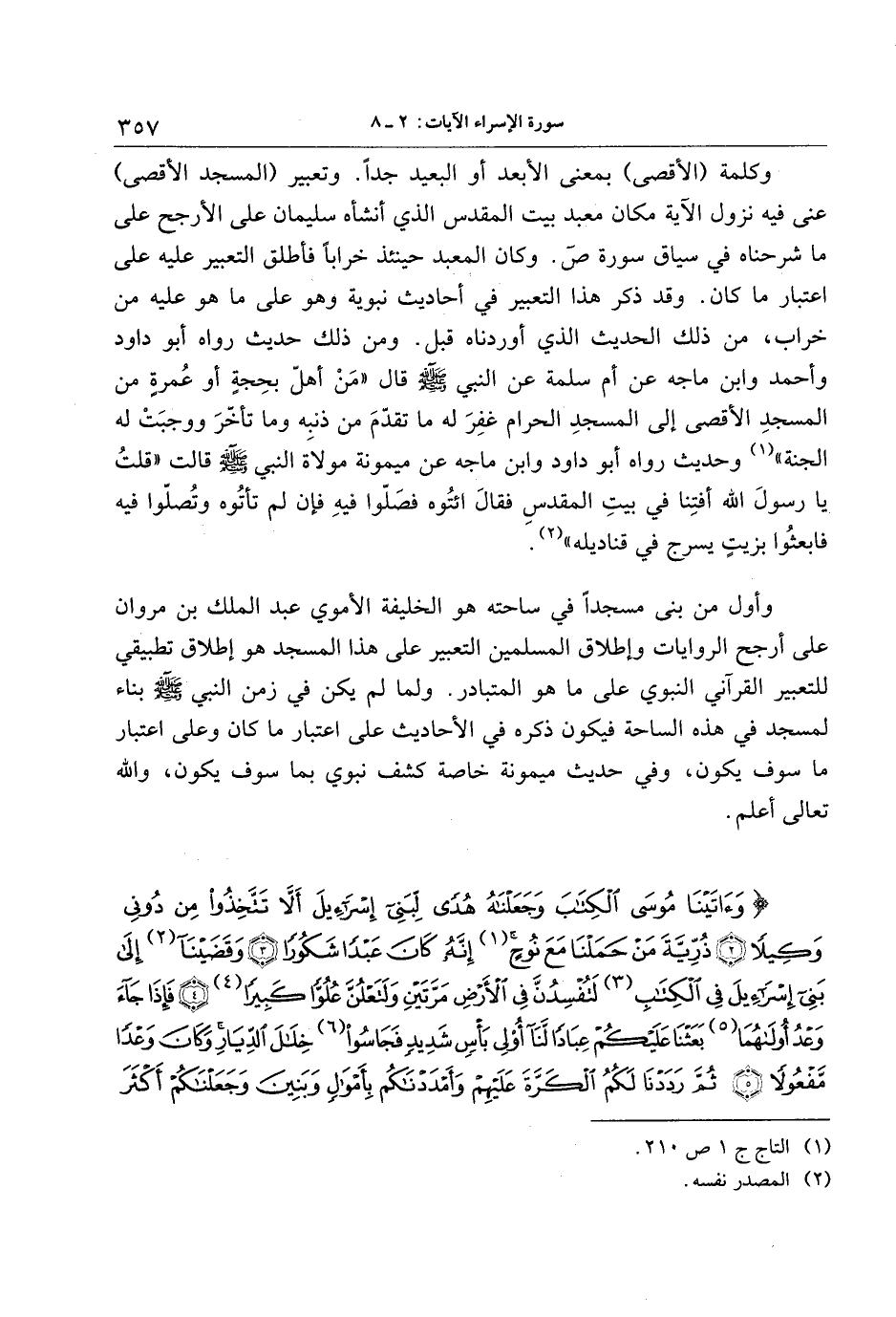 وكلمة (الأقصى) بمعنى الأبعد أو البعيد جدا. وتعبير (المسجد الأقصى) عنى فيه نزول الآية مكان معبد بيت المقدس الذي أنشأه سليمان على الأرجح على ما شرحناه في سياق سورة ص. وكان المعبد حينئذ خرابا فأطلق التعبير عليه على اعتبار ما كان. وقد ذكر هذا التعبير في أحاديث نبوية وهو على ما هو عليه من خراب، من ذلك الحديث الذي أوردناه قبل. ومن ذلك حديث رواه أبو داود وأحمد وابن ماجه عن أم سلمة عن النبي صلى الله عليه وسلم قال «من أهلّ بحجة أو عمرة من المسجد الأقصى إلى المسجد الحرام غفر له ما تقدّم من ذنبه وما تأخّر ووجبت له الجنة» «1» وحديث رواه أبو داود وابن ماجه عن ميمونة مولاة النبي صلى الله عليه وسلم قالت «قلت يا رسول الله أفتنا في بيت المقدس فقال ائتوه فصلّوا فيه فإن لم تأتوه وتصلّوا فيه فابعثوا بزيت يسرج في قناديله» «2» .