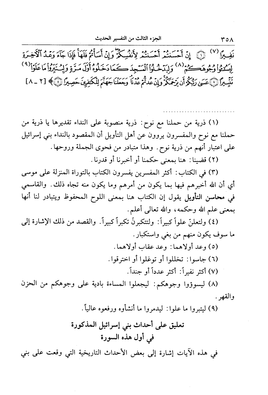(3) في الكتاب: أكثر المفسرين يفسرون الكتاب بالتوراة المنزلة على موسى أي أن الله أخبرهم فيها بما يكون من أمرهم وما يكون منه تجاه ذلك. والقاسمي في محاسن التأويل يقول إن الكتاب هنا بمعنى اللوح المحفوظ ويتبادر لنا أنها بمعنى علم الله وحكمه، والله تعالى أعلم.