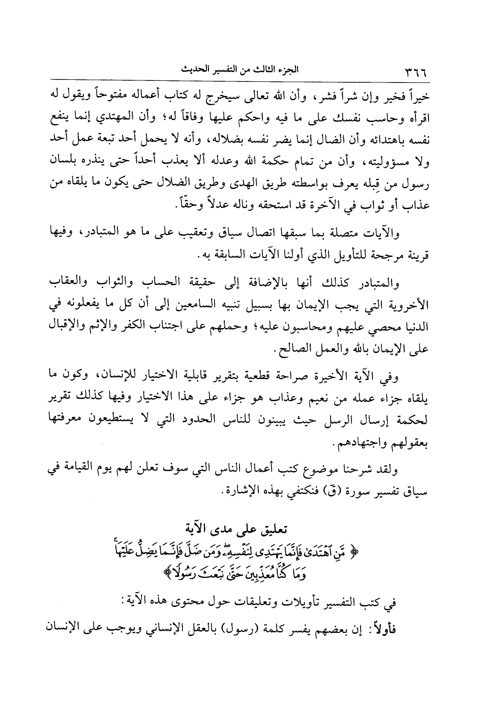 خيرا فخير وإن شرا فشر، وأن الله تعالى سيخرج له كتاب أعماله مفتوحا ويقول له اقرأه وحاسب نفسك على ما فيه واحكم عليها وفاقا له وأن المهتدي إنما ينفع نفسه باهتدائه وأن الضال إنما يضر نفسه بضلاله، وأنه لا يحمل أحد تبعة عمل أحد ولا مسؤوليته، وأن من تمام حكمة الله وعدله ألا يعذب أحدا حتى ينذره بلسان رسول من قبله يعرف بواسطته طريق الهدى وطريق الضلال حتى يكون ما يلقاه من عذاب أو ثواب في الآخرة قد استحقه وناله عدلا وحقّا.