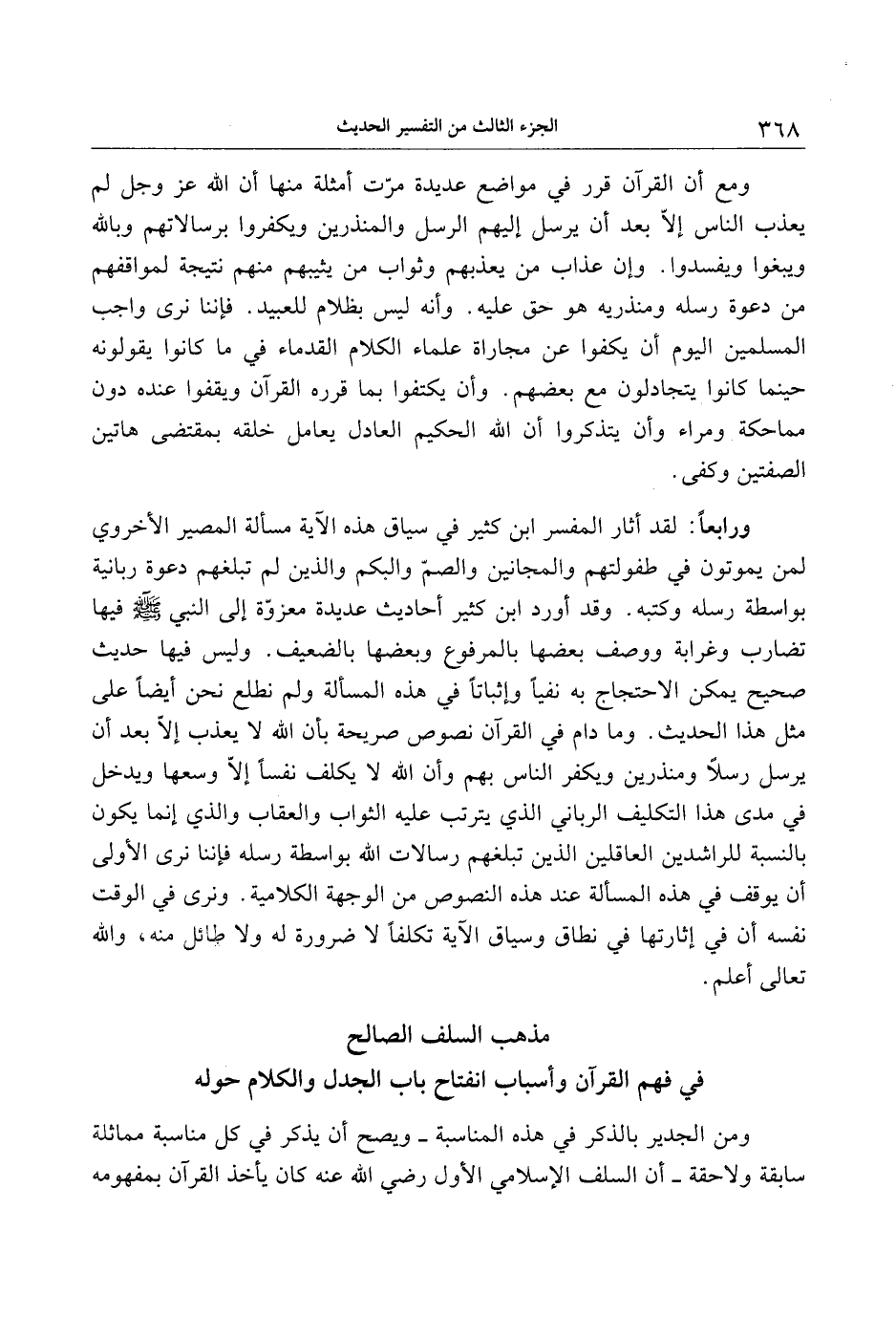 ومع أن القرآن قرر في مواضع عديدة مرّت أمثلة منها أن الله عز وجل لم يعذب الناس إلّا بعد أن يرسل إليهم الرسل والمنذرين ويكفروا برسالاتهم وبالله ويبغوا ويفسدوا. وإن عذاب من يعذبهم وثواب من يثيبهم منهم نتيجة لمواقفهم من دعوة رسله ومنذريه هو حق عليه. وأنه ليس بظلام للعبيد. فإننا نرى واجب السملمين اليوم أن يكفوا عن مجاراة علماء الكلام القدماء في ما كانوا يقولونه حينما كانوا يتجادلون مع بعضهم. وأن يكتفوا بما قرره القرآن ويقفوا عنده دون مماحكة ومراء وأن يتذكروا أن الله الحكيم العادل يعامل خلقه بمقتضى هاتين الصفتين وكفى.