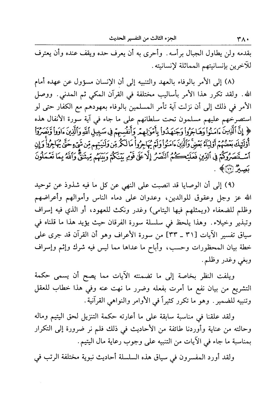 (8) إلى الأمر بالوفاء بالعهد والتنبيه إلى أن الإنسان مسؤول عن عهده أمام الله. ولقد تكرر هذا الأمر بأساليب مختلفة في القرآن المكي ثم المدني. ووصل الأمر في ذلك إلى أن نزلت آية تأمر المسلمين بالوفاء بعهودهم مع الكفار حتى لو استصرخهم عليهم مسلمون تحت سلطانهم على ما جاء في آية سورة الأنفال هذه إِنَّ الَّذِينَ آمَنُوا وَهاجَرُوا وَجاهَدُوا بِأَمْوالِهِمْ وَأَنْفُسِهِمْ فِي سَبِيلِ اللَّهِ وَالَّذِينَ آوَوْا وَنَصَرُوا أُولئِكَ بَعْضُهُمْ أَوْلِياءُ بَعْضٍ وَالَّذِينَ آمَنُوا وَلَمْ يُهاجِرُوا ما لَكُمْ مِنْ وَلايَتِهِمْ مِنْ شَيْءٍ حَتَّى يُهاجِرُوا وَإِنِ اسْتَنْصَرُوكُمْ فِي الدِّينِ فَعَلَيْكُمُ النَّصْرُ إِلَّا عَلى قَوْمٍ بَيْنَكُمْ وَبَيْنَهُمْ مِيثاقٌ وَاللَّهُ بِما تَعْمَلُونَ بَصِيرٌ. (72)