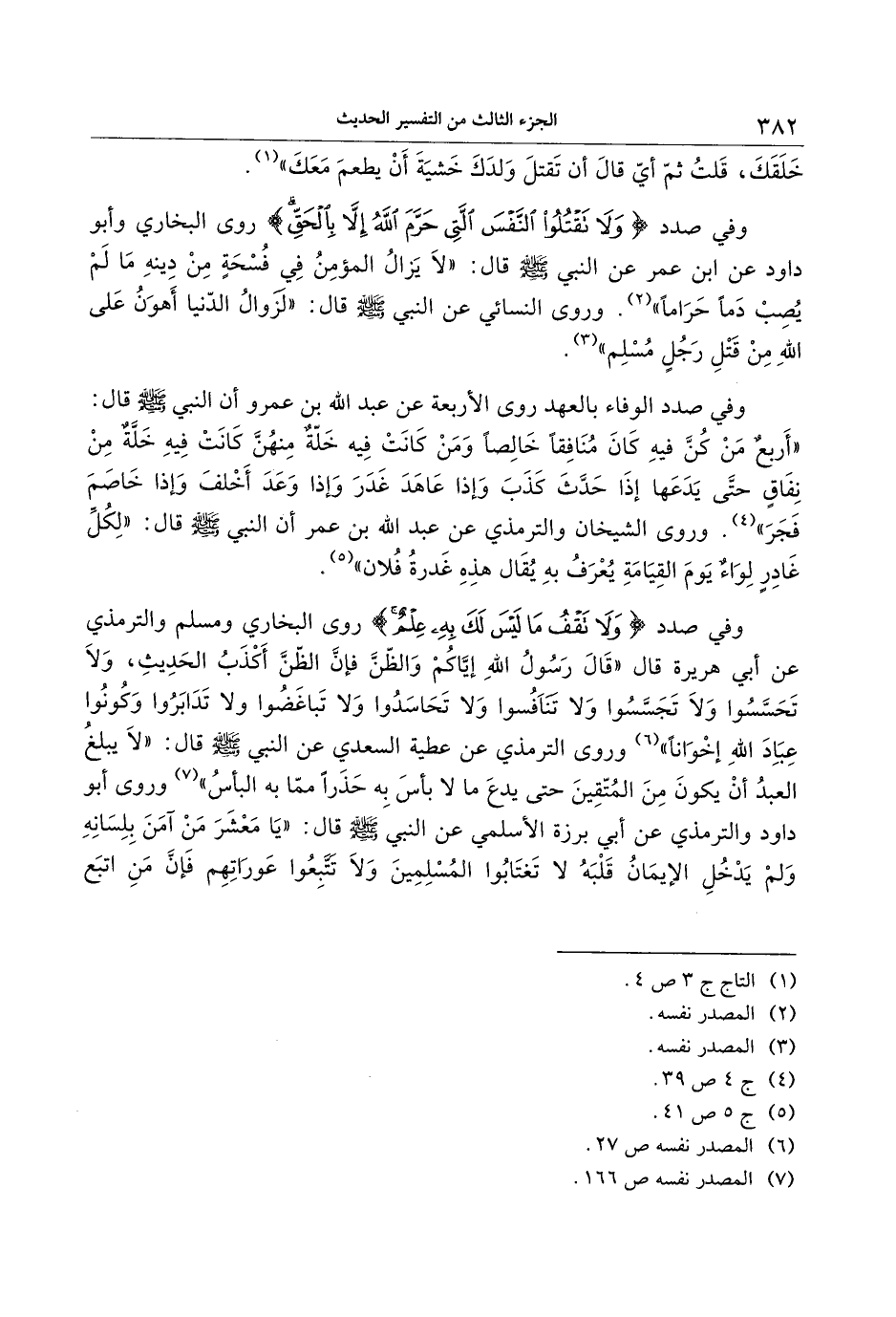 وفي صدد وَلا تَقْفُ ما لَيْسَ لَكَ بِهِ عِلْمٌ روى البخاري ومسلم والترمذي عن أبي هريرة قال «قال رسول الله إيّاكم والظّنّ فإنّ الظّنّ أكذب الحديث، ولا تحسّسوا ولا تجسّسوا ولا تنافسوا ولا تحاسدوا ولا تباغضوا ولا تدابروا وكونوا عباد الله إخوانا» «6» وروى الترمذي عن عطية السعدي عن النبي صلى الله عليه وسلم قال: «لا يبلغ العبد أن يكون من المتّقين حتى يدع ما لا بأس به حذرا ممّا به البأس» «7» وروى أبو داود والترمذي عن أبي برزة الأسلمي عن النبي صلى الله عليه وسلم قال: «يا معشر من آمن بلسانه ولم يدخل الإيمان قلبه لا تغتابوا المسلمين ولا تتّبعوا عوراتهم فإنّ من اتبع