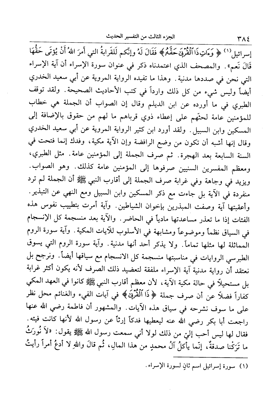 إسرائيل «1» وَآتِ ذَا الْقُرْبى حَقَّهُ فقال له وإنّكم للقرابة التي أمر الله أن يؤتى حقّها قال نعم» . والمصحف الذي اعتمدناه ذكر في عنوان سورة الإسراء أن آية الإسراء التي نحن في صددها مدنية. وهذا ما تفيده الرواية المروية عن أبي سعيد الخدري أيضا وليس شيء من كل ذلك واردا في كتب الأحاديث الصحيحة. ولقد توقف الطبري في ما أورده عن ابن الديلم وقال إن الصواب أن الجملة هي خطاب للمؤمنين عامة لحثّهم على إعطاء ذوي قرباهم ما لهم من حقوق بالإضافة إلى المسكين وابن السبيل. ولقد أورد ابن كثير الرواية المروية عن أبي سعيد الخدري وقال إنها أشبه أن تكون من وضع الرافضة وإن الآية مكية، وفدك إنما فتحت في السنة السابعة بعد الهجرة. ثم صرف الجملة إلى المؤمنين عامة. مثل الطبري، ومعظم المفسرين السنيين صرفوها إلى المؤمنين عامة كذلك. وهو الصواب.