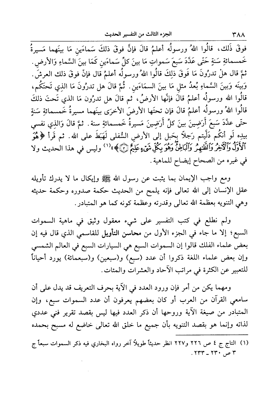 وبينه وبين السّماء بعد مثل ما بين السماءين. ثمّ قال هل تدرون ما الذي تحت ذلك قالوا الله ورسوله أعلم قال فإن تحتها الأرض الأخرى بينهما مسيرة خمسمائة سنة حتّى عدّد سبع أرضين بين كلّ أرضين مسيرة خمسمائة سنة. ثمّ قال والذي نفسي بيده لو أنكم دلّيتم رجلا بحبل إلى الأرض السّفلى لهبط على الله. ثم قرأ هُوَ الْأَوَّلُ وَالْآخِرُ وَالظَّاهِرُ وَالْباطِنُ وَهُوَ بِكُلِّ شَيْءٍ عَلِيمٌ» (3) «1» وليس في هذا الحديث ولا في غيره من الصحاح إيضاح للماهية.