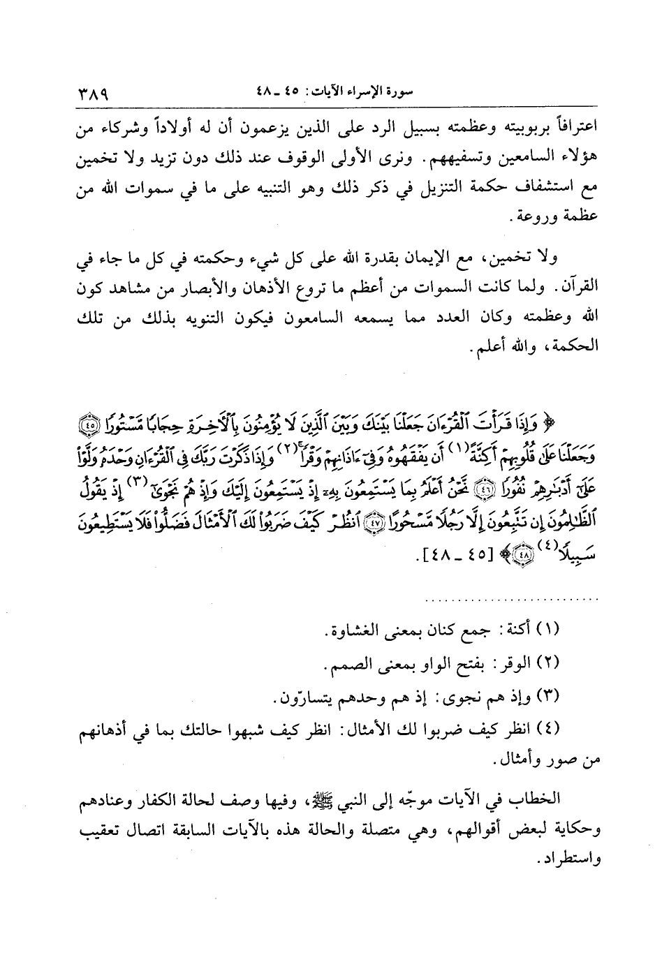 وَإِذا قَرَأْتَ الْقُرْآنَ جَعَلْنا بَيْنَكَ وَبَيْنَ الَّذِينَ لا يُؤْمِنُونَ بِالْآخِرَةِ حِجاباً مَسْتُوراً (45) وَجَعَلْنا عَلى قُلُوبِهِمْ أَكِنَّةً أَنْ يَفْقَهُوهُ وَفِي آذانِهِمْ وَقْراً وَإِذا ذَكَرْتَ رَبَّكَ فِي الْقُرْآنِ وَحْدَهُ وَلَّوْا عَلى أَدْبارِهِمْ نُفُوراً (46) نَحْنُ أَعْلَمُ بِما يَسْتَمِعُونَ بِهِ إِذْ يَسْتَمِعُونَ إِلَيْكَ وَإِذْ هُمْ نَجْوى إِذْ يَقُولُ الظَّالِمُونَ إِنْ تَتَّبِعُونَ إِلاَّ رَجُلاً مَسْحُوراً (47) انْظُرْ كَيْفَ ضَرَبُوا لَكَ الْأَمْثالَ فَضَلُّوا فَلا يَسْتَطِيعُونَ سَبِيلاً (48)