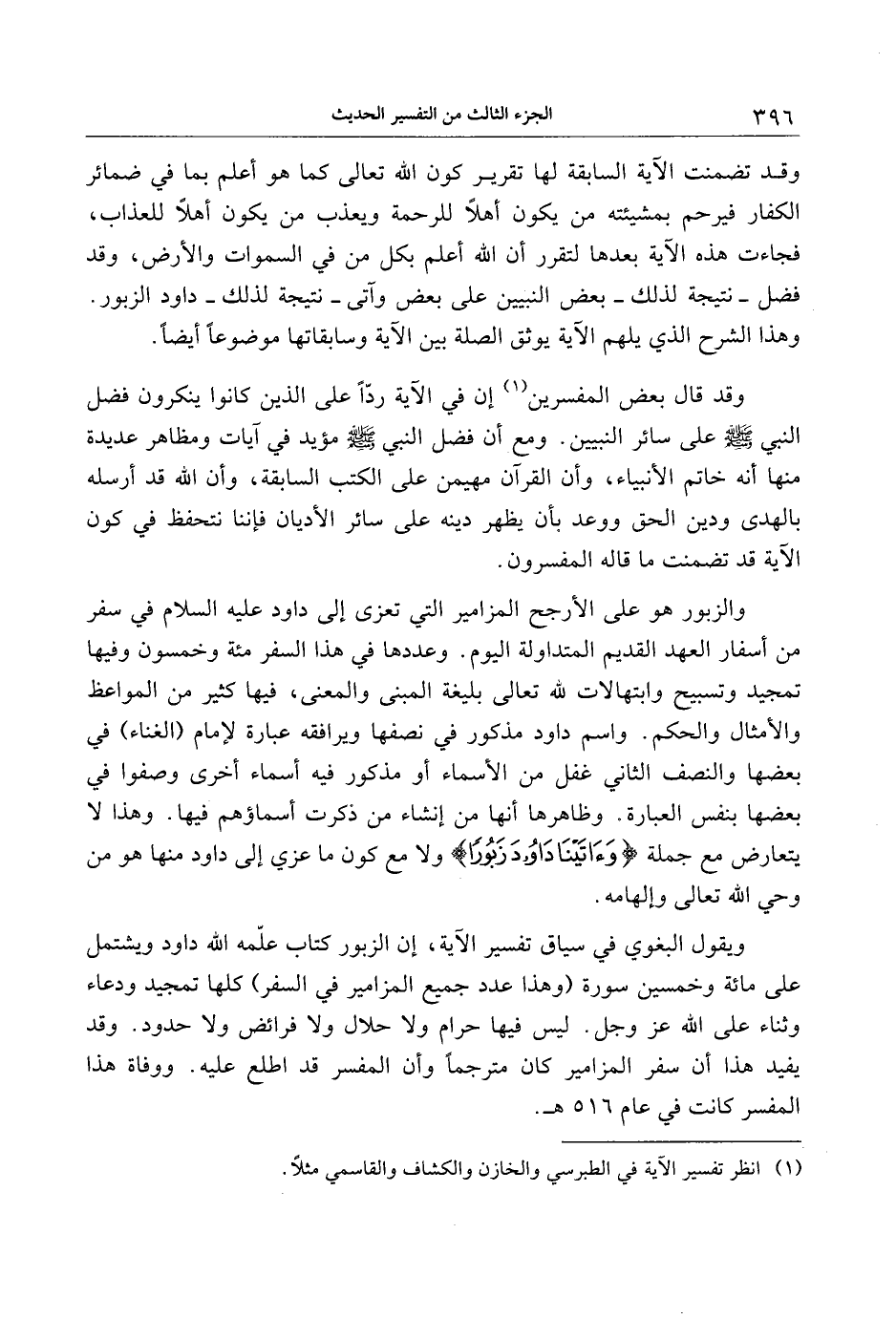 ويقول البغوي في سياق تفسير الآية، إن الزبور كتاب علّمه الله داود ويشتمل على مائة وخمسين سورة (وهذا عدد جميع المزامير في السفر) كلها تمجيد ودعاء وثناء على الله عز وجل. ليس فيها حرام ولا حلال ولا فرائض ولا حدود. وقد يفيد هذا أن سفر المزامير كان مترجما وأن المفسر قد اطلع عليه. ووفاة هذا المفسر كانت في عام 516 هـ.