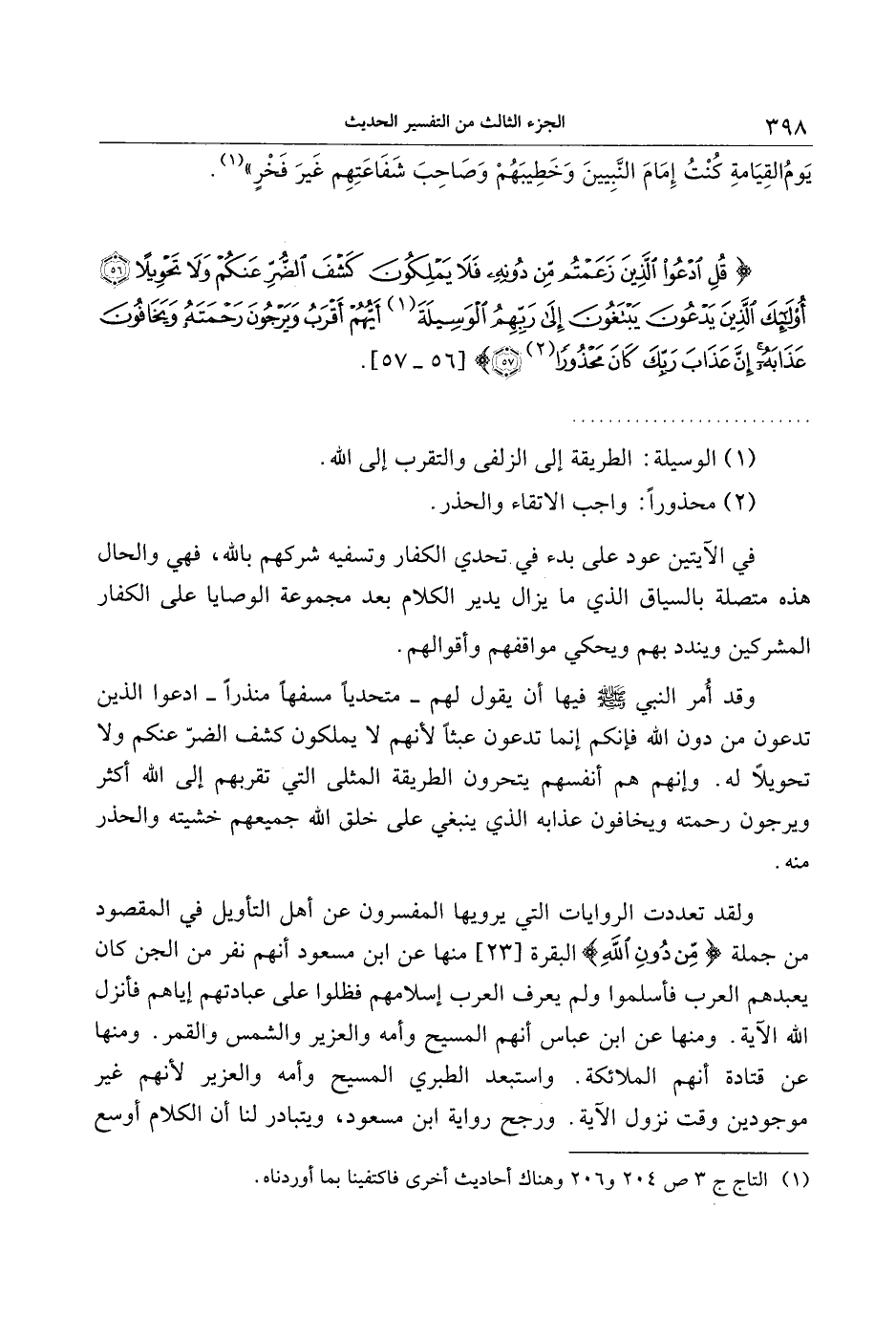 قُلِ ادْعُوا الَّذِينَ زَعَمْتُمْ مِنْ دُونِهِ فَلا يَمْلِكُونَ كَشْفَ الضُّرِّ عَنْكُمْ وَلا تَحْوِيلاً (56) أُولئِكَ الَّذِينَ يَدْعُونَ يَبْتَغُونَ إِلى رَبِّهِمُ الْوَسِيلَةَ أَيُّهُمْ أَقْرَبُ وَيَرْجُونَ رَحْمَتَهُ وَيَخافُونَ عَذابَهُ إِنَّ عَذابَ رَبِّكَ كانَ مَحْذُوراً (57)