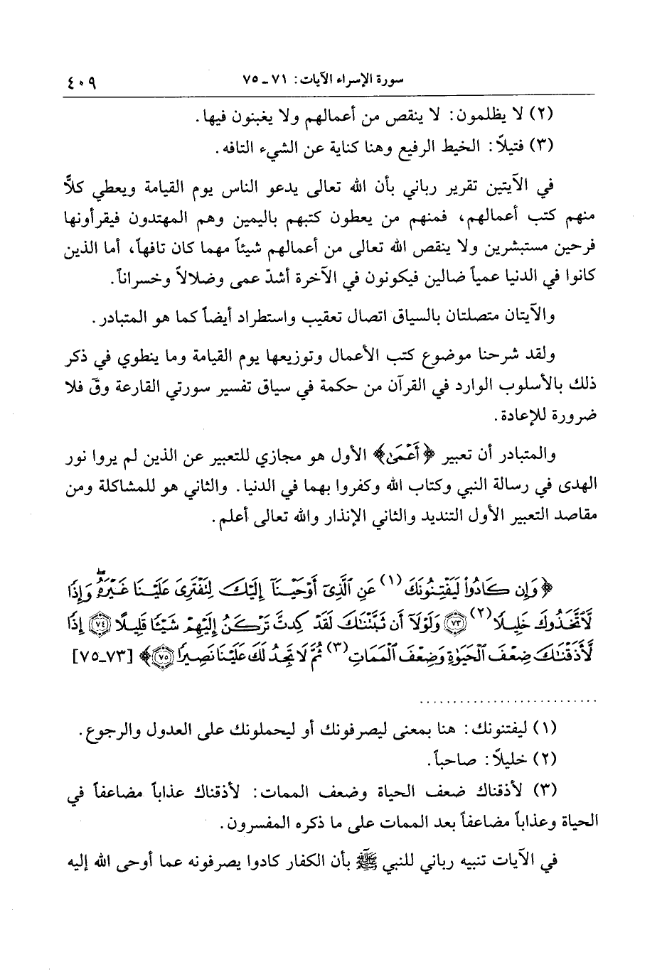 وَإِنْ كادُوا لَيَفْتِنُونَكَ عَنِ الَّذِي أَوْحَيْنا إِلَيْكَ لِتَفْتَرِيَ عَلَيْنا غَيْرَهُ وَإِذاً لاتَّخَذُوكَ خَلِيلاً (73) وَلَوْلا أَنْ ثَبَّتْناكَ لَقَدْ كِدْتَ تَرْكَنُ إِلَيْهِمْ شَيْئاً قَلِيلاً (74) إِذاً لَأَذَقْناكَ ضِعْفَ الْحَياةِ وَضِعْفَ الْمَماتِ ثُمَّ لا تَجِدُ لَكَ عَلَيْنا نَصِيراً (75)
