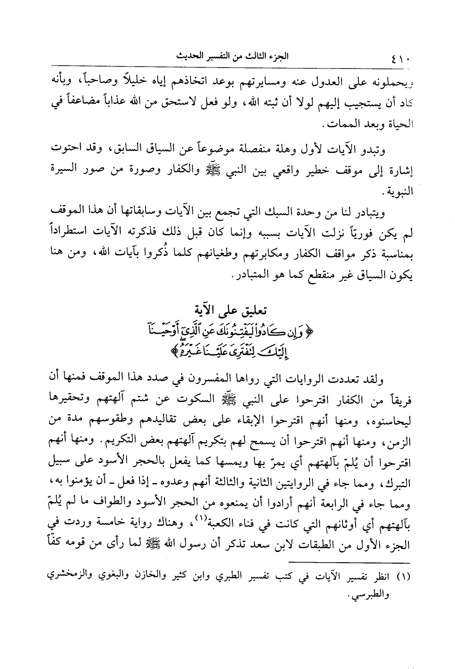 ولقد تعددت الروايات التي رواها المفسرون في صدد هذا الموقف فمنها أن فريقا من الكفار اقترحوا على النبي صلى الله عليه وسلم السكوت عن شتم آلهتهم وتحقيرها ليحاسنوه، ومنها أنهم اقترحوا الإبقاء على بعض تقاليدهم وطقوسهم مدة من الزمن، ومنها أنهم اقترحوا أن يسمح لهم بتكريم آلهتهم بعض التكريم. ومنها أنهم اقترحوا أن يلمّ بآلهتهم أي يمرّ بها ويمسها كما يفعل بالحجر الأسود على سبيل التبرك، ومما جاء في الروايتين الثانية والثالثة أنهم وعدوه- إذا فعل- أن يؤمنوا به، ومما جاء في الرابعة أنهم أرادوا أن يمنعوه من الحجر الأسود والطواف ما لم يلمّ بآلهتهم أي أوثانهم التي كانت في فناء الكعبة «1» ، وهناك رواية خامسة وردت في الجزء الأول من الطبقات لابن سعد تذكر أن رسول الله صلى الله عليه وسلم لما رأى من قومه كفّا