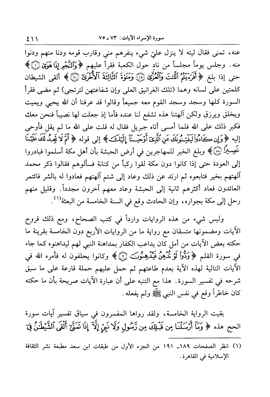 عنه، تمنى فقال ليته لا ينزل عليّ شيء ينفرهم مني وقارب قومه ودنا منهم ودنوا منه. وجلس يوما مجلسا من ناد حول الكعبة فقرأ عليهم وَالنَّجْمِ إِذا هَوى (1) حتى إذا بلغ أَفَرَأَيْتُمُ اللَّاتَ وَالْعُزَّى (19) وَمَناةَ الثَّالِثَةَ الْأُخْرى (20) ألقى الشيطان كلمتين على لسانه وهما (تلك الغرانيق العلى وإن شفاعتهن لترتجى) ثم مضى فقرأ السورة كلها وسجد وسجد القوم معه جميعا وقالوا قد عرفنا أن الله يحيي ويميت ويخلق ويرزق ولكن آلهتنا هذه تشفع لنا عنده فأما إذ جعلت لها نصيبا فنحن معك فكبر ذلك على الله فلما أمسى أتاه جبريل فقال له قلت على الله ما لم يقل فأوحى إليه وَإِنْ كادُوا لَيَفْتِنُونَكَ عَنِ الَّذِي أَوْحَيْنا إِلَيْكَ إلى قوله ثُمَّ لا تَجِدُ لَكَ عَلَيْنا نَصِيراً (75) وبلغ الخبر للمهاجرين في أرض الحبشة بأن أهل مكة أسلموا فبادروا إلى العودة حتى إذا كانوا دون مكة لقوا ركبا من كنانة فسألوهم فقالوا ذكر محمد آلهتهم بخير فتابعوه ثم ارتد عن ذلك وعاد إلى شتم آلهتهم فعادوا له بالشر فائتمر العائدون فعاد أكثرهم ثانية إلى الحبشة وعاد معهم آخرون مجددا. وقليل منهم رحل إلى مكة بجواره، وإن الحادث وقع في السنة الخامسة من البعثة «1» .