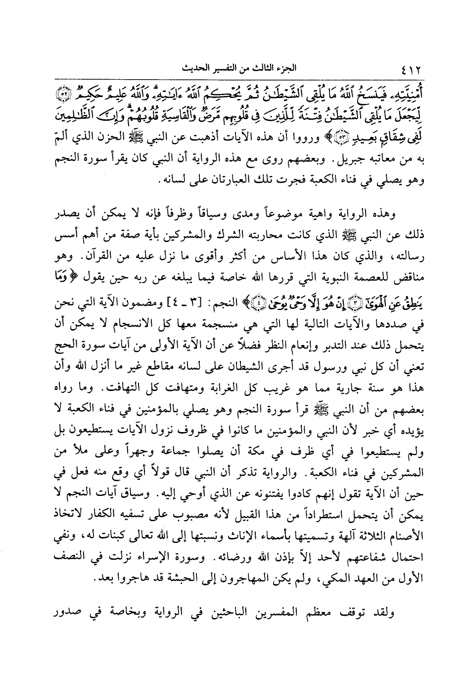 وهذه الرواية واهية موضوعا ومدى وسياقا وظرفا فإنه لا يمكن أن يصدر ذلك عن النبي صلى الله عليه وسلم الذي كانت محاربته الشرك والمشركين بأية صفة من أهم أسس رسالته، والذي كان هذا الأساس من أكثر وأقوى ما نزل عليه من القرآن. وهو مناقض للعصمة النبوية التي قررها الله خاصة فيما يبلغه عن ربه حين يقول وَما يَنْطِقُ عَنِ الْهَوى (3) إِنْ هُوَ إِلَّا وَحْيٌ يُوحى (4) النجم: [3- 4] ومضمون الآية التي نحن في صددها والآيات التالية لها التي هي منسجمة معها كل الانسجام لا يمكن أن يتحمل ذلك عند التدبر وإنعام النظر فضلا عن أن الآية الأولى من آيات سورة الحج تعني أن كل نبي ورسول قد أجرى الشيطان على لسانه مقاطع غير ما أنزل الله وأن هذا هو سنة جارية مما هو غريب كل الغرابة ومتهافت كل التهافت. وما رواه بعضهم من أن النبي صلى الله عليه وسلم قرأ سورة النجم وهو يصلي بالمؤمنين في فناء الكعبة لا يؤيده أي خبر لأن النبي والمؤمنين ما كانوا في ظروف نزول الآيات يستطيعون بل ولم يستطيعوا في أي ظرف في مكة أن يصلوا جماعة وجهرا وعلى ملأ من المشركين في فناء الكعبة. والرواية تذكر أن النبي قال قولا أي وقع منه فعل في حين أن الآية تقول إنهم كادوا يفتنونه عن الذي أوحي إليه. وسياق آيات النجم لا يمكن أن يتحمل استطرادا من هذا القبيل لأنه مصبوب على تسفيه الكفار لاتخاذ الأصنام الثلاثة آلهة وتسميتها بأسماء الإناث ونسبتها إلى الله تعالى كبنات له، ونفي احتمال شفاعتهم لأحد إلّا بإذن الله ورضائه. وسورة الإسراء نزلت في النصف الأول من العهد المكي، ولم يكن المهاجرون إلى الحبشة قد هاجروا بعد.