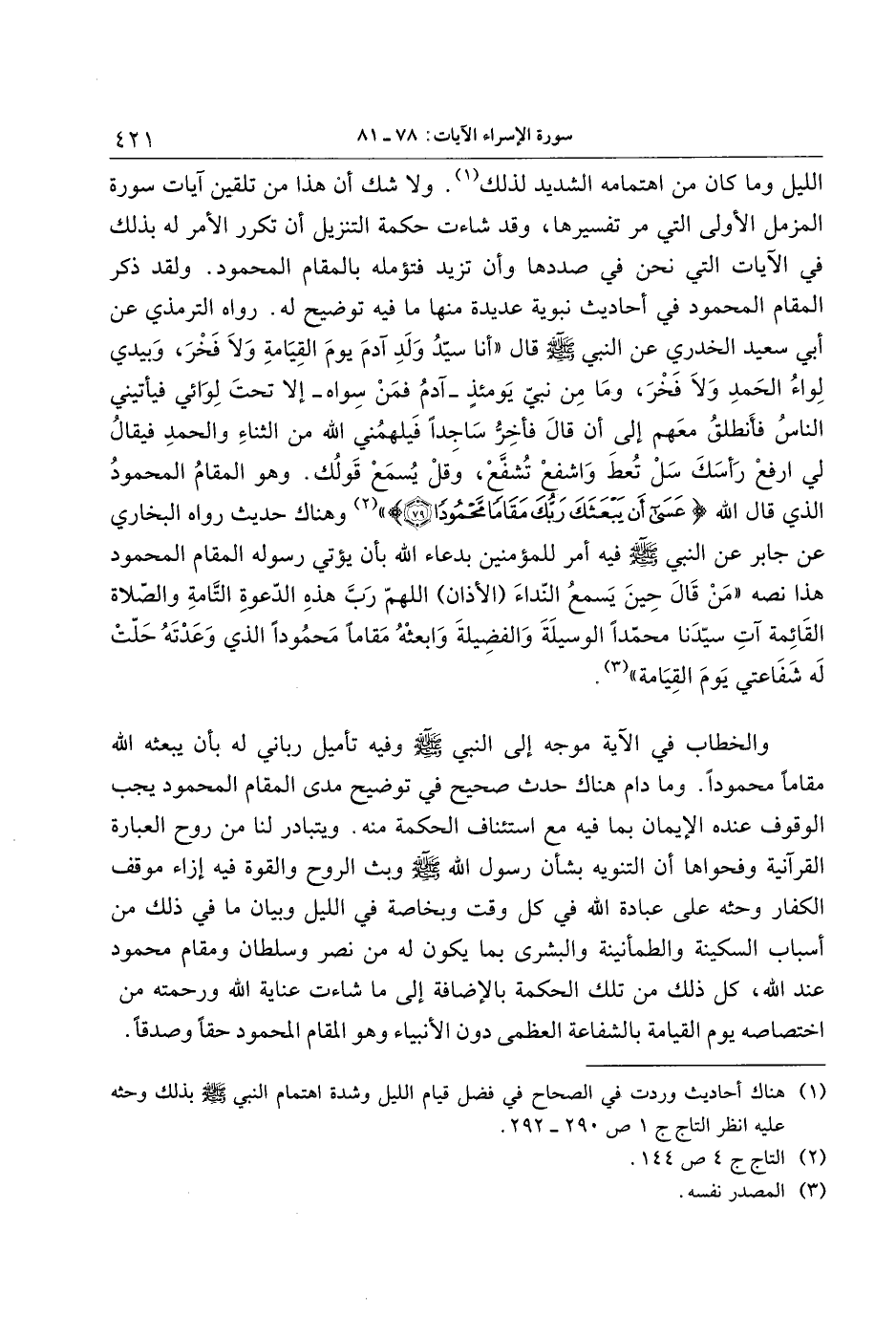 الليل وما كان من اهتمامه الشديد لذلك «1» . ولا شك أن هذا من تلقين آيات سورة المزمل الأولى التي مر تفسيرها، وقد شاءت حكمة التنزيل أن تكرر الأمر له بذلك في الآيات التي نحن في صددها وأن تزيد فتؤمله بالمقام المحمود. ولقد ذكر المقام المحمود في أحاديث نبوية عديدة منها ما فيه توضيح له. رواه الترمذي عن أبي سعيد الخدري عن النبي صلى الله عليه وسلم قال «أنا سيّد ولد آدم يوم القيامة ولا فخر، وبيدي لواء الحمد ولا فخر، وما من نبيّ يومئذ- آدم فمن سواه- إلا تحت لوائي فيأتيني الناس فأنطلق معهم إلى أن قال فأخرّ ساجدا فيلهمني الله من الثناء والحمد فيقال لي ارفع رأسك سل تعط واشفع تشفّع، وقل يسمع قولك. وهو المقام المحمود الذي قال الله عَسى أَنْ يَبْعَثَكَ رَبُّكَ مَقاماً مَحْمُوداً (79) » «2» وهناك حديث رواه البخاري عن جابر عن النبي صلى الله عليه وسلم فيه أمر للمؤمنين بدعاء الله بأن يؤتي رسوله المقام المحمود هذا نصه «من قال حين يسمع النّداء (الأذان) اللهمّ ربّ هذه الدّعوة التّامة والصّلاة القائمة آت سيّدنا محمّدا الوسيلة والفضيلة وابعثه مقاما محمودا الذي وعدته حلّت له شفاعتي يوم القيامة» «3» .