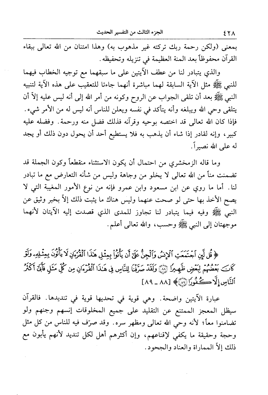 عبارة الآيتين واضحة. وهي قوية في تحديها قوية في تنديدها. فالقرآن سيظل المعجز الممتنع عن التقليد على جميع المخلوقات إنسهم وجنهم ولو تضامنوا معا لأنه وحي الله تعالى ومظهر سره. وقد صرّف فيه للناس من كل مثل وحجة وحقيقة ما يكفي لإقناعهم، وإن أكثرهم أهل لكل تنديد لأنهم يأبون مع ذلك إلّا المماراة والعناد والجحود.