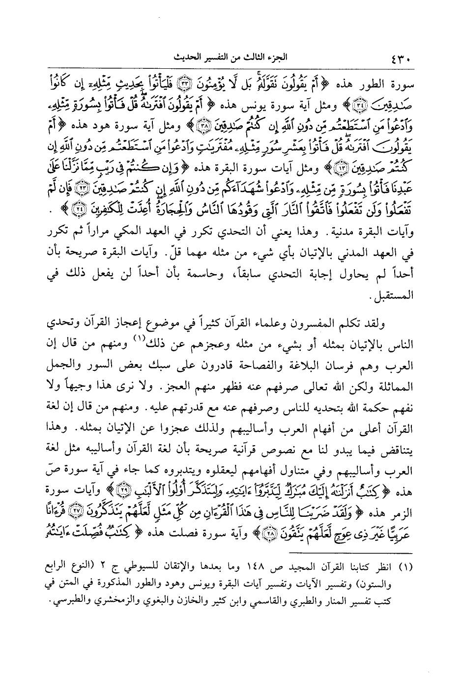 (1) انظر كتابنا القرآن المجيد ص 148 وما بعدها والإتقان للسيوطي ج 2 (النوع الرابع والستون) وتفسير الآيات وتفسير آيات البقرة ويونس وهود والطور المذكورة في المتن في كتب تفسير المنار والطبري والقاسمي وابن كثير والخازن والبغوي والزمخشري والطبرسي.