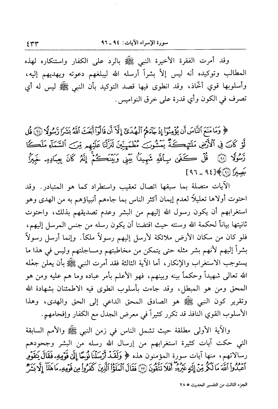 الآيات متصلة بما سبقها اتصال تعقيب واستطراد كما هو المتبادر. وقد احتوت أولاها تعليلا لعدم إيمان أكثر الناس بما جاءهم أنبياؤهم به من الهدى وهو استغرابهم أن يكون رسول الله إليهم من البشر وعدم تصديقهم بذلك، واحتوت ثانيتها بيانا لحكمة الله وسنته حيث اقتضتا أن يكون رسله من جنس المرسل إليهم، فلو كان من سكان الأرض ملائكة لأرسل إليهم رسولا ملكا. وإنما أرسل رسولا بشرا إليهم لأنهم بشر مثله حتى يتمكن من مخاطبتهم ومساجلتهم وليس في هذا ما يستوجب الاستغراب والإنكار، أما الآية الثالثة فقد أمرت النبي صلى الله عليه وسلم بأن يعلن جعله الله تعالى شهيدا وحكما بينه وبينهم، فهو الأعلم بأمر عباده وما هم عليه ومن هو المحق ومن هو المبطل، وقد جاءت بأسلوب انطوى فيه الاطمئنان بشهادة الله وتقرير كون النبي صلى الله عليه وسلم هو الصادق المحق الداعي إلى الحق والهدى، وهذا الأسلوب القوي النافذ قد تكرر كثيرا في معرض الجدل مع الكفار وإفحامهم.