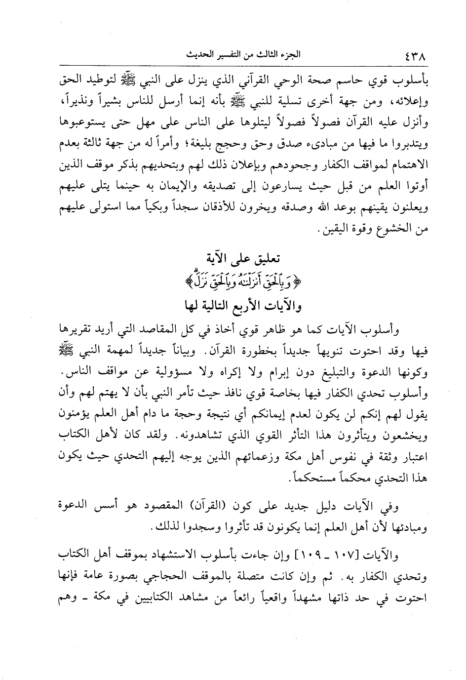 والآيات [107- 109] وإن جاءت بأسلوب الاستشهاد بموقف أهل الكتاب وتحدي الكفار به. ثم وإن كانت متصلة بالموقف الحجاجي بصورة عامة فإنها احتوت في حد ذاتها مشهدا واقعيا رائعا من مشاهد الكتابيين في مكة- وهم