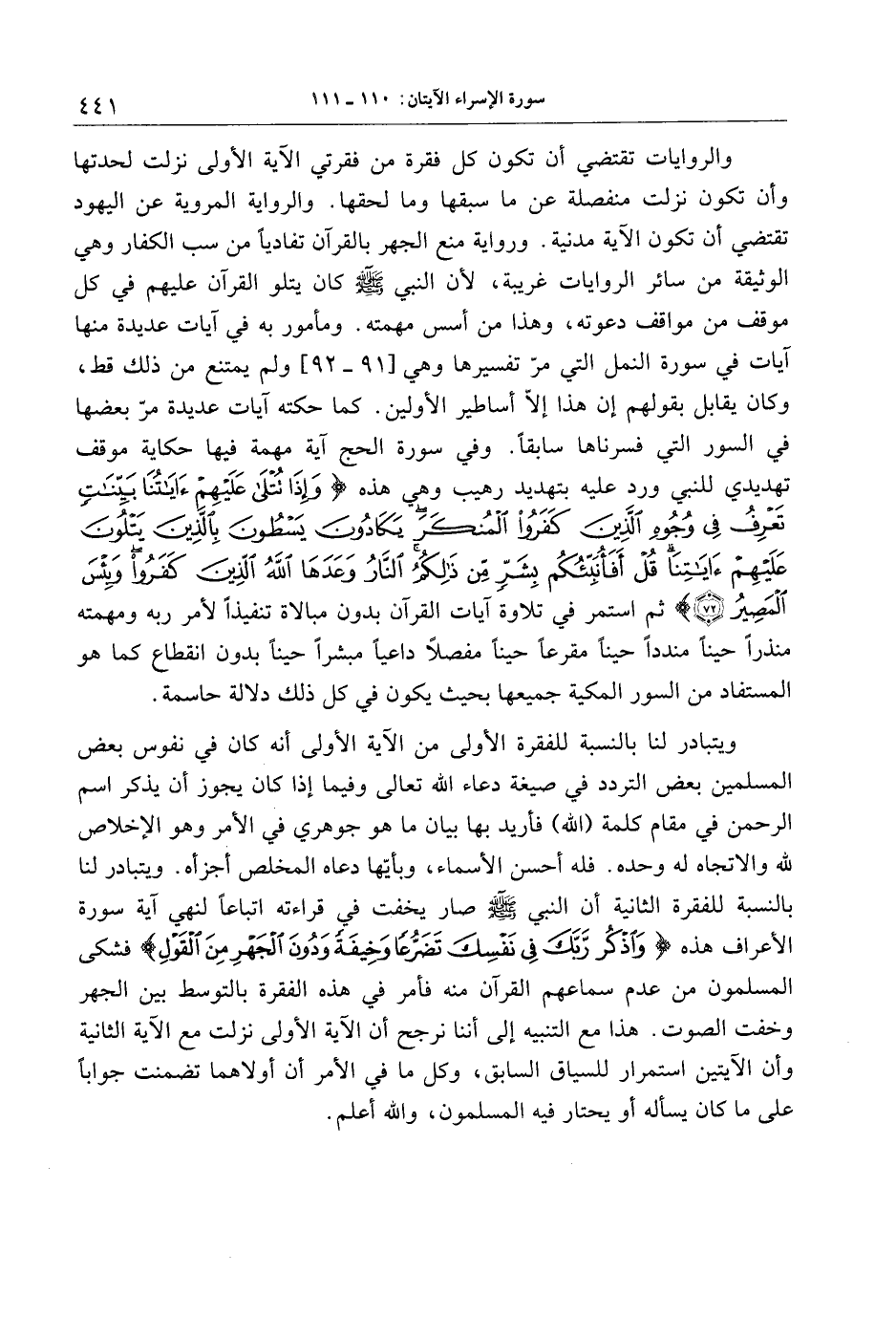 ويتبادر لنا بالنسبة للفقرة الأولى من الآية الأولى أنه كان في نفوس بعض المسلمين بعض التردد في صيغة دعاء الله تعالى وفيما إذا كان يجوز أن يذكر اسم الرحمن في مقام كلمة (الله) فأريد بها بيان ما هو جوهري في الأمر وهو الإخلاص لله والاتجاه له وحده. فله أحسن الأسماء، وبأيّها دعاه المخلص أجزأه. ويتبادر لنا بالنسبة للفقرة الثانية أن النبي صلى الله عليه وسلم صار يخفت في قراءته اتباعا لنهي آية سورة الأعراف هذه وَاذْكُرْ رَبَّكَ فِي نَفْسِكَ تَضَرُّعاً وَخِيفَةً وَدُونَ الْجَهْرِ مِنَ الْقَوْلِ فشكى المسلمون من عدم سماعهم القرآن منه فأمر في هذه الفقرة بالتوسط بين الجهر وخفت الصوت. هذا مع التنبيه إلى أننا نرجح أن الآية الأولى نزلت مع الآية الثانية وأن الآيتين استمرار للسياق السابق، وكل ما في الأمر أن أولاهما تضمنت جوابا على ما كان يسأله أو يحتار فيه المسلمون، والله أعلم.