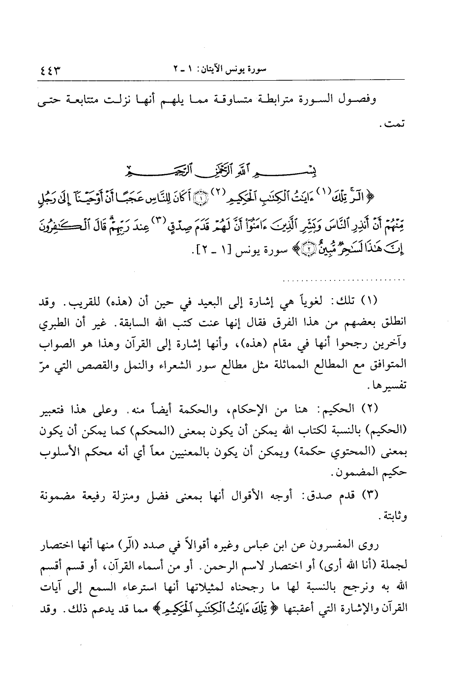 روى المفسرون عن ابن عباس وغيره أقوالا في صدد (الر) منها أنها اختصار لجملة (أنا الله أرى) أو اختصار لاسم الرحمن. أو من أسماء القرآن، أو قسم أقسم الله به ونرجح بالنسبة لها ما رجحناه لمثيلاتها أنها استرعاء السمع إلى آيات القرآن والإشارة التي أعقبتها تِلْكَ آياتُ الْكِتابِ الْحَكِيمِ مما قد يدعم ذلك. وقد