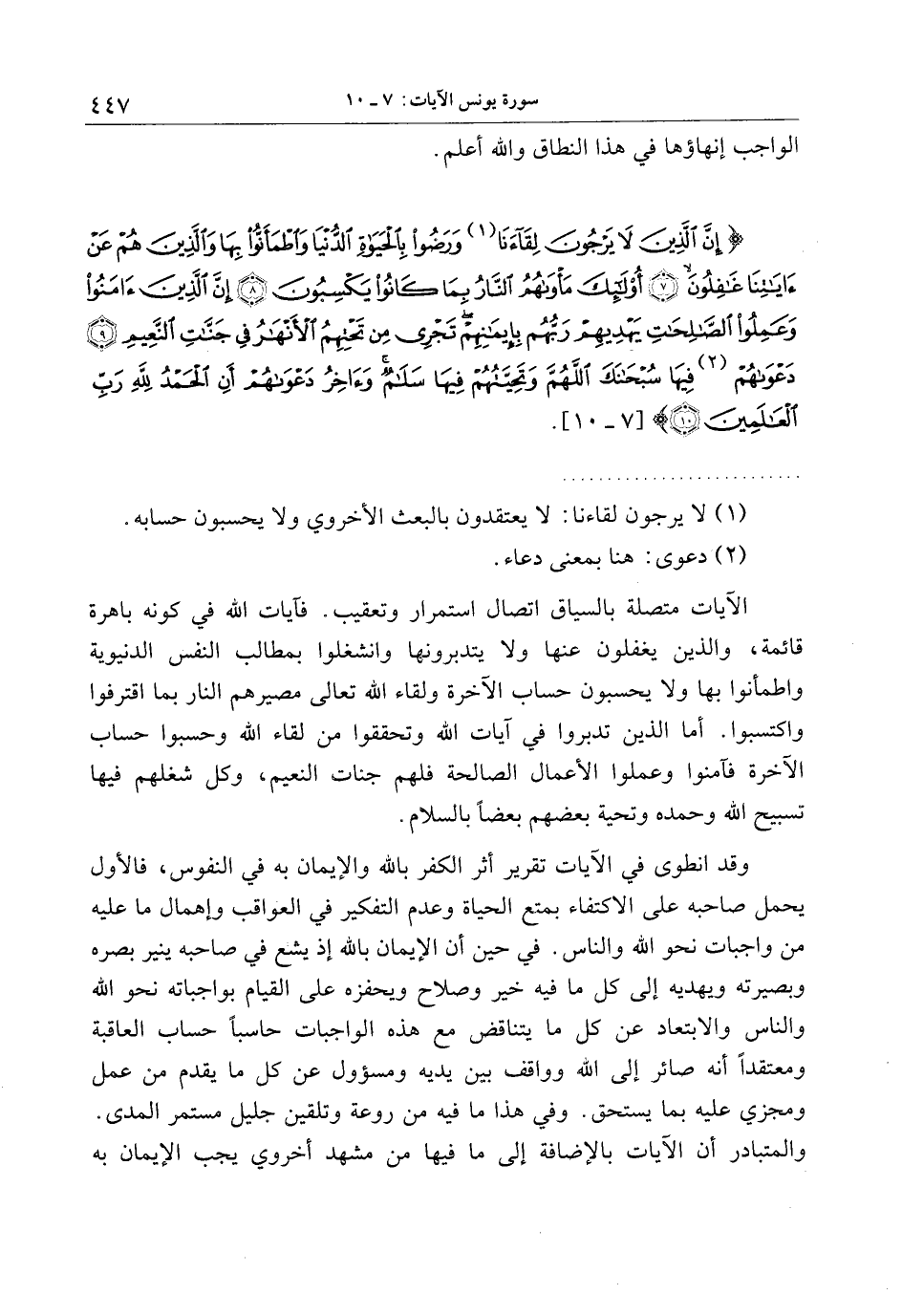 إِنَّ الَّذِينَ لا يَرْجُونَ لِقاءَنا وَرَضُوا بِالْحَياةِ الدُّنْيا وَاطْمَأَنُّوا بِها وَالَّذِينَ هُمْ عَنْ آياتِنا غافِلُونَ (7) أُولئِكَ مَأْواهُمُ النَّارُ بِما كانُوا يَكْسِبُونَ (8) إِنَّ الَّذِينَ آمَنُوا وَعَمِلُوا الصَّالِحاتِ يَهْدِيهِمْ رَبُّهُمْ بِإِيمانِهِمْ تَجْرِي مِنْ تَحْتِهِمُ الْأَنْهارُ فِي جَنَّاتِ النَّعِيمِ (9) دَعْواهُمْ فِيها سُبْحانَكَ اللَّهُمَّ وَتَحِيَّتُهُمْ فِيها سَلامٌ وَآخِرُ دَعْواهُمْ أَنِ الْحَمْدُ لِلَّهِ رَبِّ الْعالَمِينَ (10)