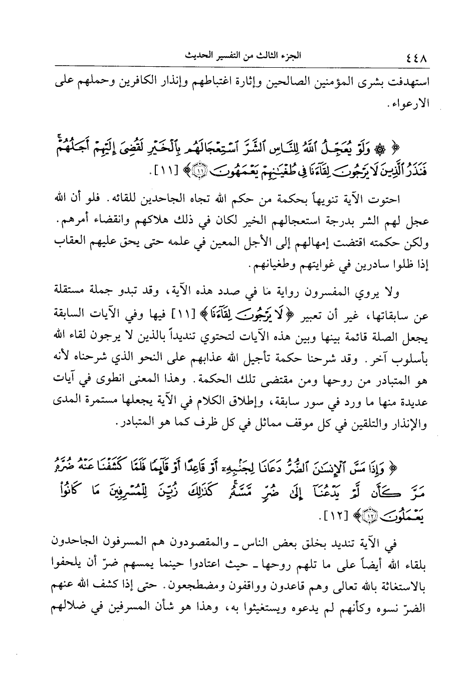 ولا يروي المفسرون رواية ما في صدد هذه الآية، وقد تبدو جملة مستقلة عن سابقاتها، غير أن تعبير لا يَرْجُونَ لِقاءَنا [11] فيها وفي الآيات السابقة يجعل الصلة قائمة بينها وبين هذه الآيات لتحتوي تنديدا بالذين لا يرجون لقاء الله بأسلوب آخر. وقد شرحنا حكمة تأجيل الله عذابهم على النحو الذي شرحناه لأنه هو المتبادر من روحها ومن مقتضى تلك الحكمة. وهذا المعنى انطوى في آيات عديدة منها ما ورد في سور سابقة، وإطلاق الكلام في الآية يجعلها مستمرة المدى والإنذار والتلقين في كل موقف مماثل في كل ظرف كما هو المتبادر.