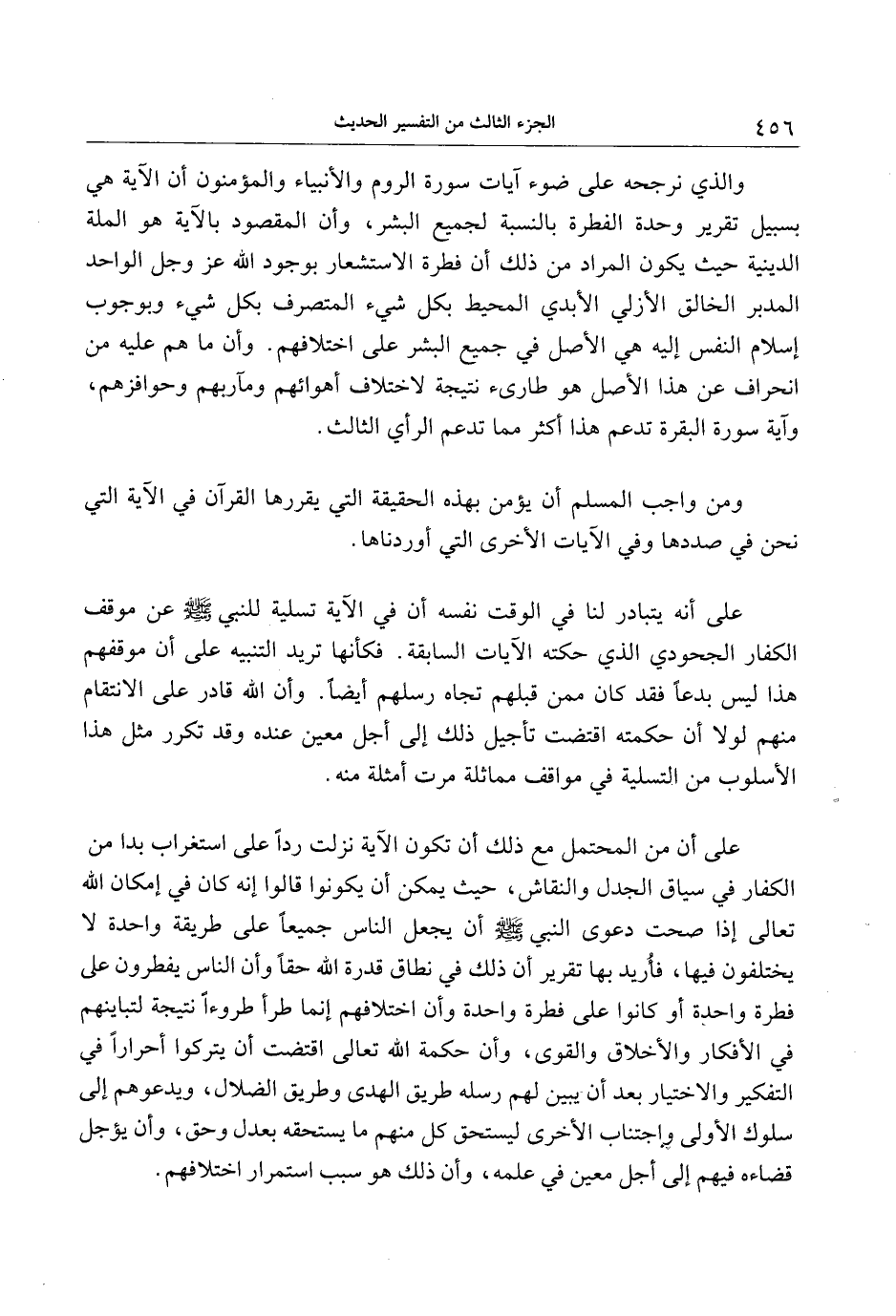 والذي نرجحه على ضوء آيات سورة الروم والأنبياء والمؤمنون أن الآية هي بسبيل تقرير وحدة الفطرة بالنسبة لجميع البشر، وأن المقصود بالآية هو الملة الدينية حيث يكون المراد من ذلك أن فطرة الاستشعار بوجود الله عز وجل الواحد المدبر الخالق الأزلي الأبدي المحيط بكل شيء المتصرف بكل شيء وبوجوب إسلام النفس إليه هي الأصل في جميع البشر على اختلافهم. وأن ما هم عليه من انحراف عن هذا الأصل هو طارئ نتيجة لاختلاف أهوائهم وماربهم وحوافزهم، وآية سورة البقرة تدعم هذا أكثر مما تدعم الرأي الثالث.