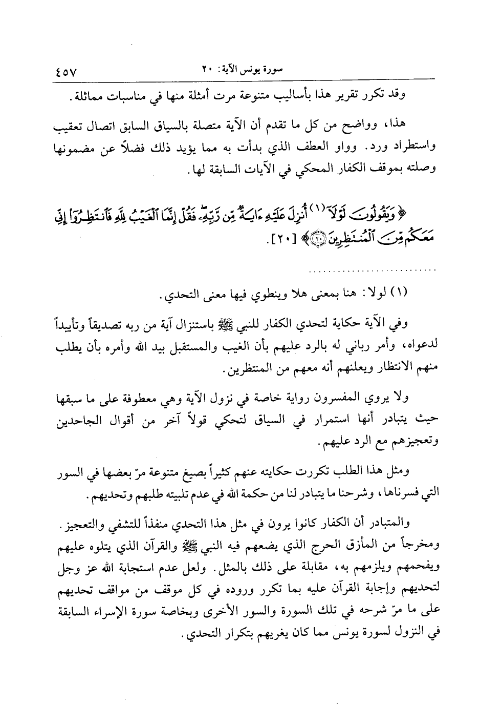 ومخرجا من المأزق الحرج الذي يضعهم فيه النبي صلى الله عليه وسلم والقرآن الذي يتلوه عليهم ويفحمهم ويلزمهم به، مقابلة على ذلك بالمثل. ولعل عدم استجابة الله عز وجل لتحديهم وإجابة القرآن عليه بما تكرر وروده في كل موقف من مواقف تحديهم على ما مرّ شرحه في تلك السورة والسور الأخرى وبخاصة سورة الإسراء السابقة في النزول لسورة يونس مما كان يغريهم بتكرار التحدي.