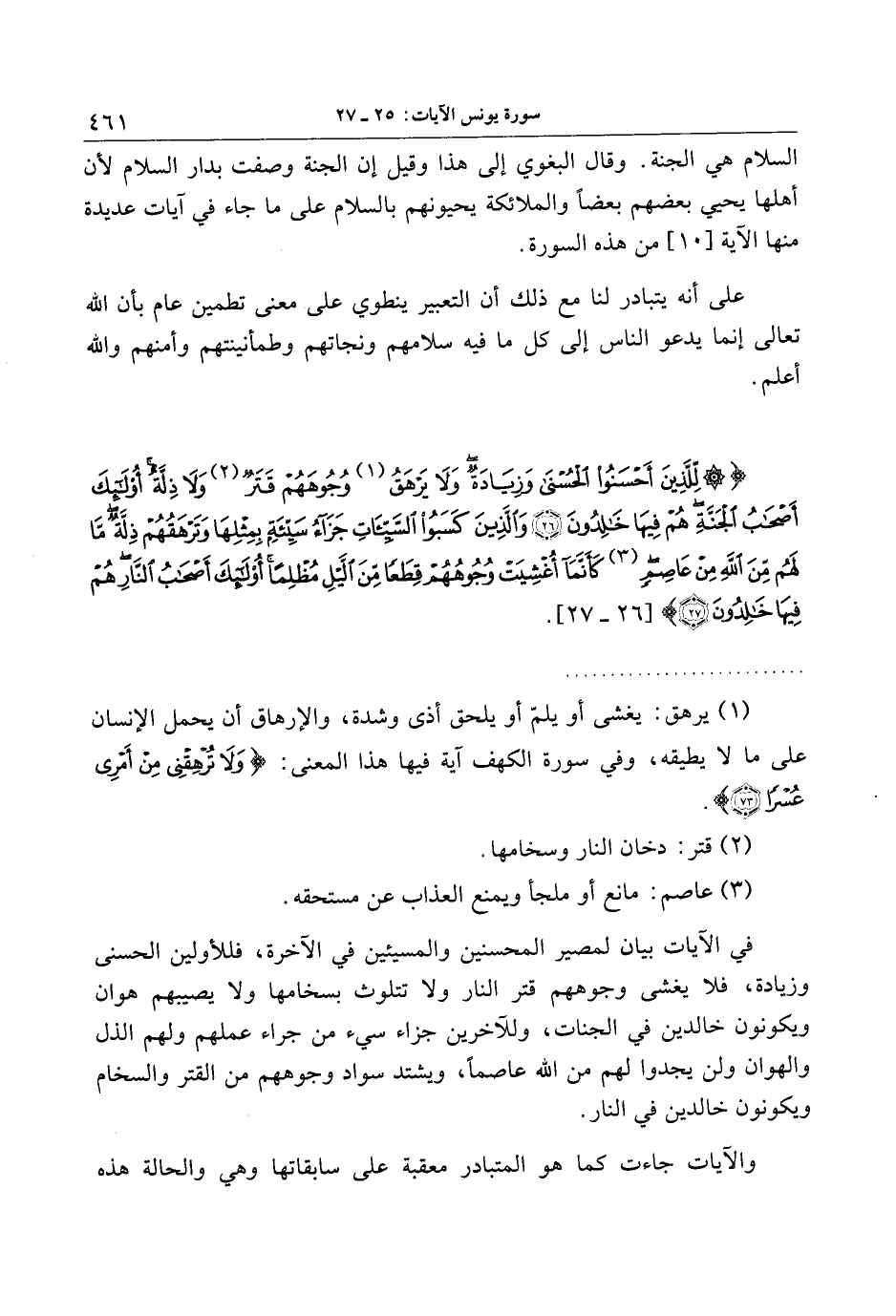 لِلَّذِينَ أَحْسَنُوا الْحُسْنى وَزِيادَةٌ وَلا يَرْهَقُ وُجُوهَهُمْ قَتَرٌ وَلا ذِلَّةٌ أُولئِكَ أَصْحابُ الْجَنَّةِ هُمْ فِيها خالِدُونَ (26) وَالَّذِينَ كَسَبُوا السَّيِّئاتِ جَزاءُ سَيِّئَةٍ بِمِثْلِها وَتَرْهَقُهُمْ ذِلَّةٌ ما لَهُمْ مِنَ اللَّهِ مِنْ عاصِمٍ كَأَنَّما أُغْشِيَتْ وُجُوهُهُمْ قِطَعاً مِنَ اللَّيْلِ مُظْلِماً أُولئِكَ أَصْحابُ النَّارِ هُمْ فِيها خالِدُونَ (27)