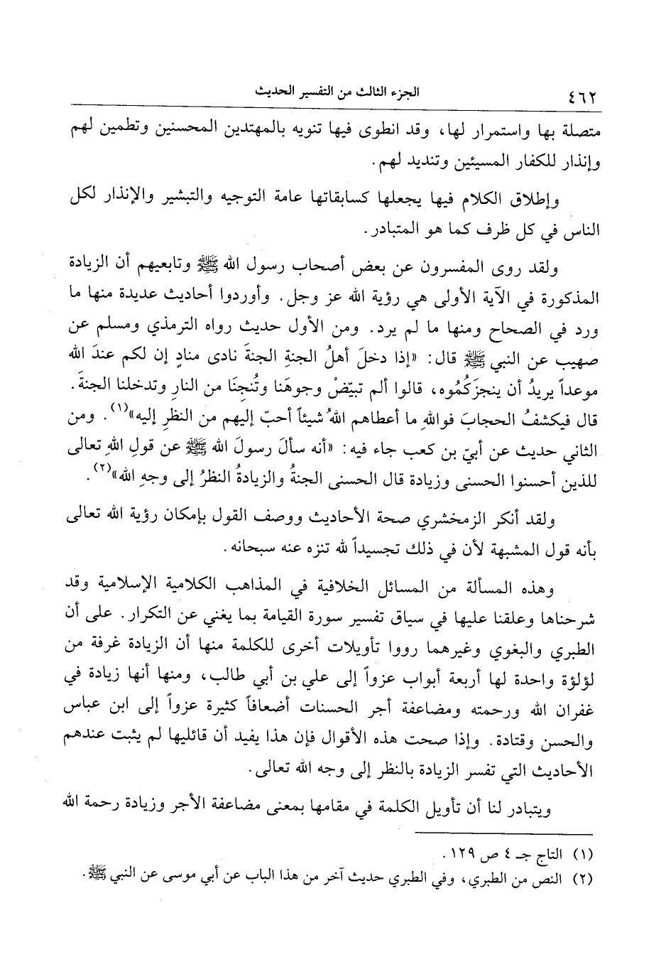 وهذه المسألة من المسائل الخلافية في المذاهب الكلامية الإسلامية وقد شرحناها وعلقنا عليها في سياق تفسير سورة القيامة بما يغني عن التكرار. على أن الطبري والبغوي وغيرهما رووا تأويلات أخرى للكلمة منها أن الزيادة غرفة من لؤلؤة واحدة لها أربعة أبواب عزوا إلى علي بن أبي طالب، ومنها أنها زيادة في غفران الله ورحمته ومضاعفة أجر الحسنات أضعافا كثيرة عزوا إلى ابن عباس والحسن وقتادة. وإذا صحت هذه الأقوال فإن هذا يفيد أن قائليها لم يثبت عندهم الأحاديث التي تفسر الزيادة بالنظر إلى وجه الله تعالى.