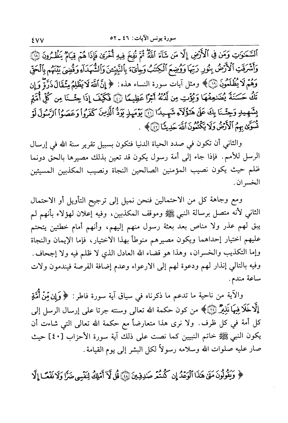 والآية من ناحية ما تدعم ما ذكرناه في سياق آية سورة فاطر: وَإِنْ مِنْ أُمَّةٍ إِلَّا خَلا فِيها نَذِيرٌ (24) من كون حكمة الله تعالى وسنته جرتا على إرسال الرسل إلى كل أمة في كل ظرف. ولا نرى هذا متعارضا مع حكمة الله تعالى التي شاءت أن يكون النبي صلى الله عليه وسلم خاتم النبيين كما نصت على ذلك آية سورة الأحزاب [40] حيث صار عليه صلوات الله وسلامه رسولا لكل البشر إلى يوم القيامة.