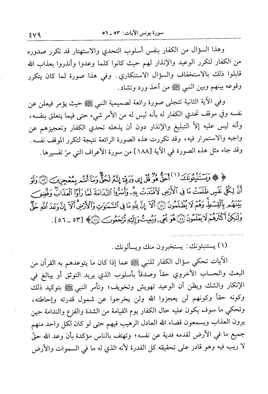 وَيَسْتَنْبِئُونَكَ أَحَقٌّ هُوَ قُلْ إِي وَرَبِّي إِنَّهُ لَحَقٌّ وَما أَنْتُمْ بِمُعْجِزِينَ (53) وَلَوْ أَنَّ لِكُلِّ نَفْسٍ ظَلَمَتْ ما فِي الْأَرْضِ لافْتَدَتْ بِهِ وَأَسَرُّوا النَّدامَةَ لَمَّا رَأَوُا الْعَذابَ وَقُضِيَ بَيْنَهُمْ بِالْقِسْطِ وَهُمْ لا يُظْلَمُونَ (54) أَلا إِنَّ لِلَّهِ ما فِي السَّماواتِ وَالْأَرْضِ أَلا إِنَّ وَعْدَ اللَّهِ حَقٌّ وَلكِنَّ أَكْثَرَهُمْ لا يَعْلَمُونَ (55) هُوَ يُحيِي وَيُمِيتُ وَإِلَيْهِ تُرْجَعُونَ (56)