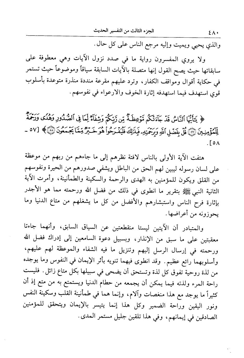. هتفت الآية الأولى بالناس لا فتة نظرهم إلى ما جاءهم من ربهم من موعظة على لسان رسوله ليبين لهم الحق من الباطل ويشفي صدورهم من الحيرة ونفوسهم من القلق ويكون للمؤمنين به الهدى والرحمة والسكينة والطمأنينة، وأمرت الآية الثانية النبي صلى الله عليه وسلم بتقرير ما انطوى في ذلك من فضل الله ورحمته مما هو الأجدر بإثارة فرح الناس واستبشارهم والأفضل من كل ما يشغلهم من متاع الدنيا وما يحوزونه من أعراضها.