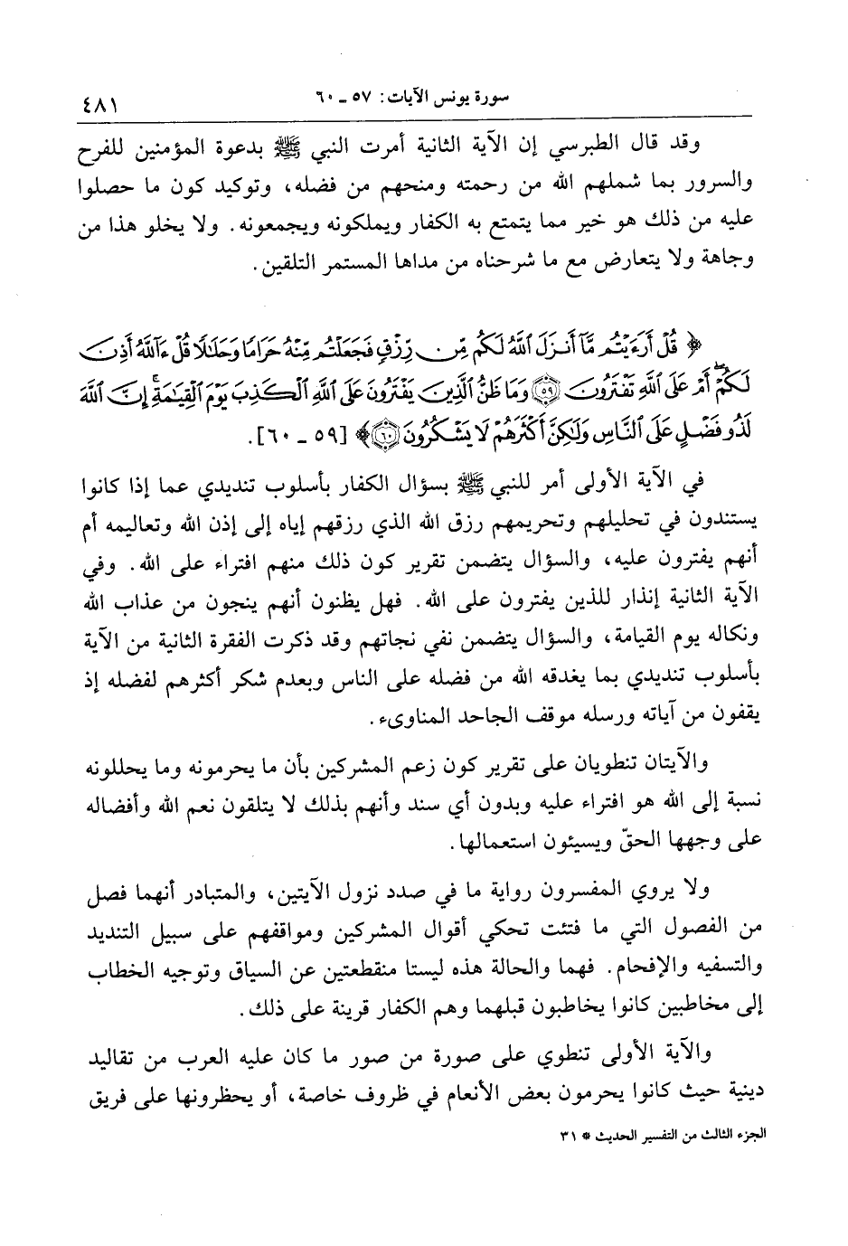 . في الآية الأولى أمر للنبي صلى الله عليه وسلم بسؤال الكفار بأسلوب تنديدي عما إذا كانوا يستندون في تحليلهم وتحريمهم رزق الله الذي رزقهم إياه إلى إذن الله وتعاليمه أم أنهم يفترون عليه، والسؤال يتضمن تقرير كون ذلك منهم افتراء على الله. وفي الآية الثانية إنذار للذين يفترون على الله. فهل يظنون أنهم ينجون من عذاب الله ونكاله يوم القيامة، والسؤال يتضمن نفي نجاتهم وقد ذكرت الفقرة الثانية من الآية بأسلوب تنديدي بما يغدقه الله من فضله على الناس وبعدم شكر أكثرهم لفضله إذ يقفون من آياته ورسله موقف الجاحد المناوئ.