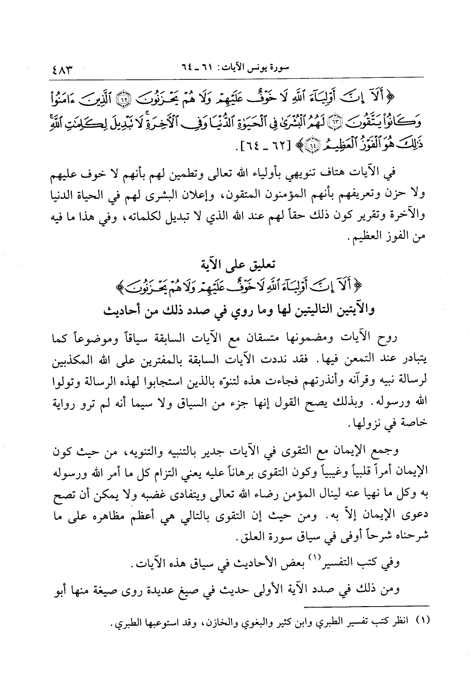 تعليق على الآية أَلا إِنَّ أَوْلِياءَ اللَّهِ لا خَوْفٌ عَلَيْهِمْ وَلا هُمْ يَحْزَنُونَ والآيتين التاليتين لها وما روي في صدد ذلك من أحاديث