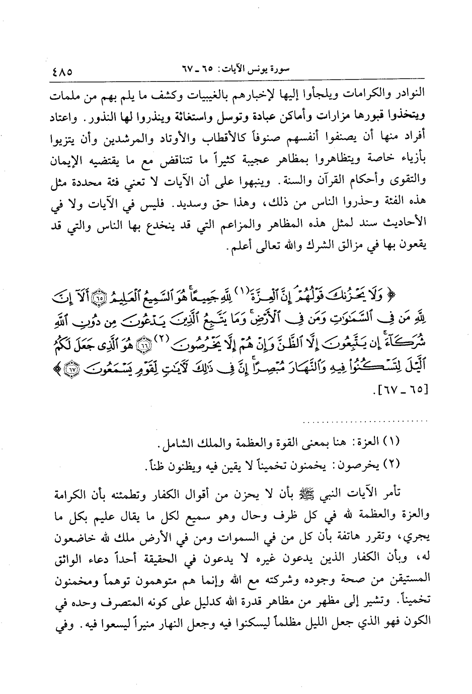 وَلا يَحْزُنْكَ قَوْلُهُمْ إِنَّ الْعِزَّةَ لِلَّهِ جَمِيعاً هُوَ السَّمِيعُ الْعَلِيمُ (65) أَلا إِنَّ لِلَّهِ مَنْ فِي السَّماواتِ وَمَنْ فِي الْأَرْضِ وَما يَتَّبِعُ الَّذِينَ يَدْعُونَ مِنْ دُونِ اللَّهِ شُرَكاءَ إِنْ يَتَّبِعُونَ إِلاَّ الظَّنَّ وَإِنْ هُمْ إِلاَّ يَخْرُصُونَ (66) هُوَ الَّذِي جَعَلَ لَكُمُ اللَّيْلَ لِتَسْكُنُوا فِيهِ وَالنَّهارَ مُبْصِراً إِنَّ فِي ذلِكَ لَآياتٍ لِقَوْمٍ يَسْمَعُونَ (67)
