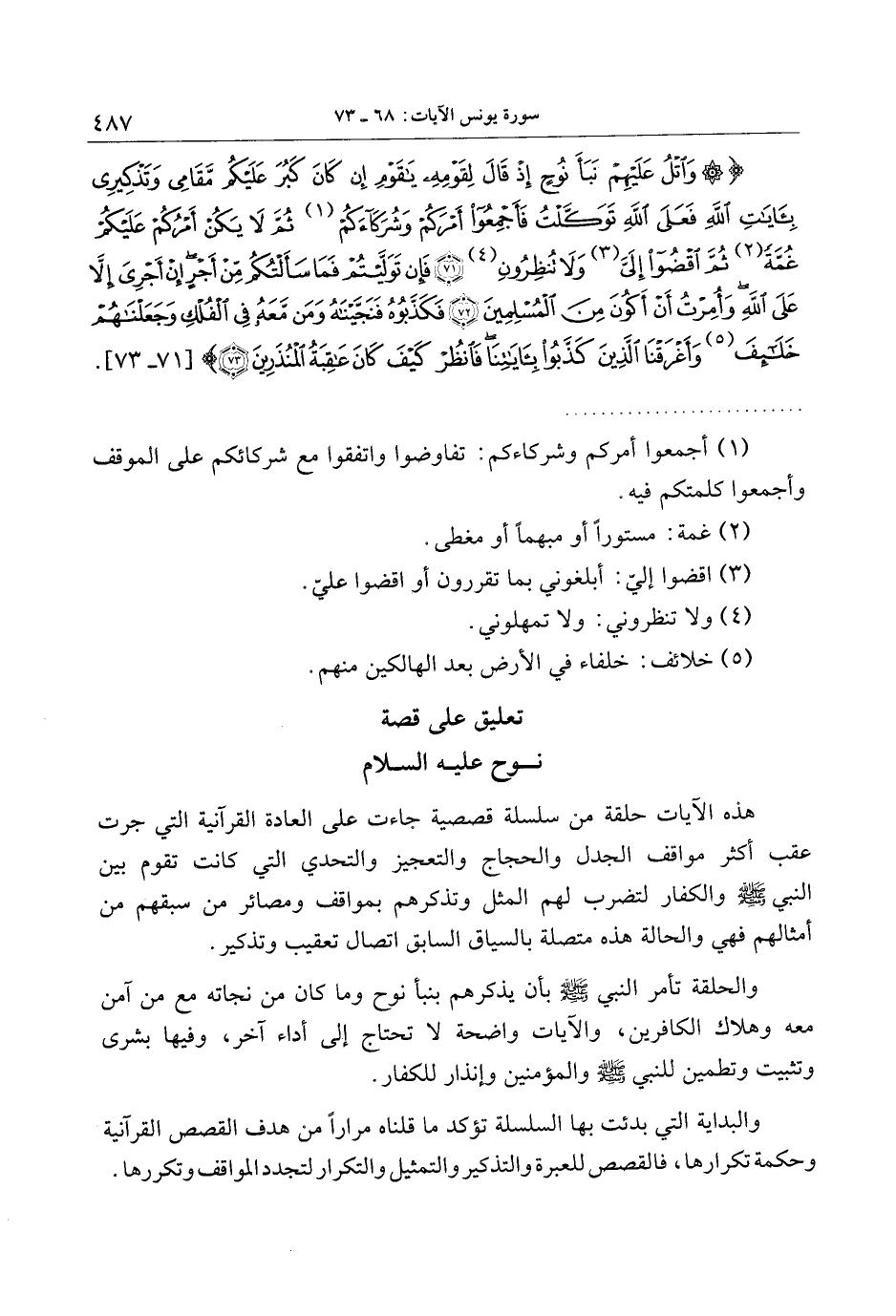 والحلقة تأمر النبي صلى الله عليه وسلم بأن يذكرهم بنبإ نوح وما كان من نجاته مع من آمن معه وهلاك الكافرين، والآيات واضحة لا تحتاج إلى أداء آخر، وفيها بشرى وتثبيت وتطمين للنبي صلى الله عليه وسلم والمؤمنين وإنذار للكفار.