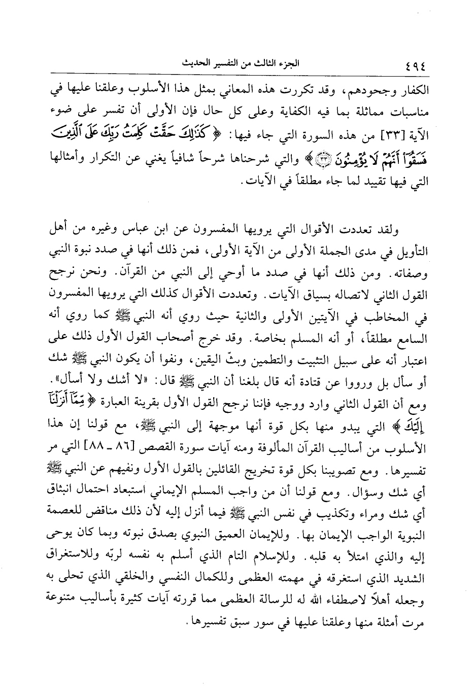 ومع أن القول الثاني وارد ووجيه فإننا نرجح القول الأول بقرينة العبارة مِمَّا أَنْزَلْنا إِلَيْكَ التي يبدو منها بكل قوة أنها موجهة إلى النبي صلى الله عليه وسلم، مع قولنا إن هذا الأسلوب من أساليب القرآن المألوفة ومنه آيات سورة القصص [86- 88] التي مر تفسيرها. ومع تصويبنا بكل قوة تخريج القائلين بالقول الأول ونفيهم عن النبي صلى الله عليه وسلم أي شك وسؤال. ومع قولنا أن من واجب المسلم الإيماني استبعاد احتمال انبثاق أي شك ومراء وتكذيب في نفس النبي صلى الله عليه وسلم فيما أنزل إليه لأن ذلك مناقض للعصمة النبوية الواجب الإيمان بها. وللإيمان العميق النبوي بصدق نبوته وبما كان يوحى إليه والذي امتلأ به قلبه. وللإسلام التام الذي أسلم به نفسه لربّه وللاستغراق الشديد الذي استغرقه في مهمته العظمى وللكمال النفسي والخلقي الذي تحلى به وجعله أهلا لاصطفاء الله له للرسالة العظمى مما قررته آيات كثيرة بأساليب متنوعة مرت أمثلة منها وعلقنا عليها في سور سبق تفسيرها.