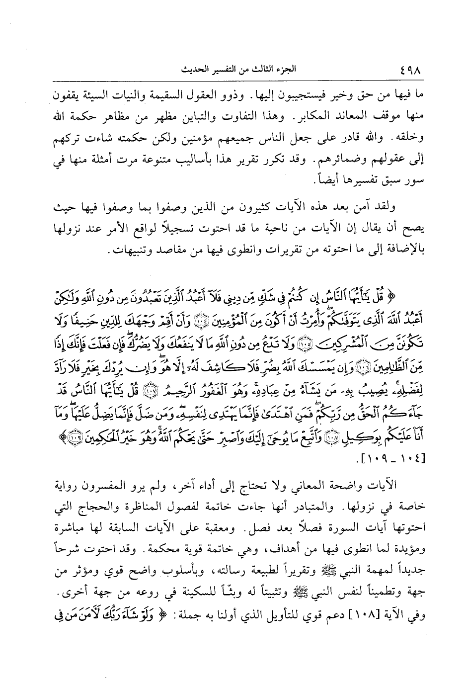 قُلْ يا أَيُّهَا النَّاسُ إِنْ كُنْتُمْ فِي شَكٍّ مِنْ دِينِي فَلا أَعْبُدُ الَّذِينَ تَعْبُدُونَ مِنْ دُونِ اللَّهِ وَلكِنْ أَعْبُدُ اللَّهَ الَّذِي يَتَوَفَّاكُمْ وَأُمِرْتُ أَنْ أَكُونَ مِنَ الْمُؤْمِنِينَ (104) وَأَنْ أَقِمْ وَجْهَكَ لِلدِّينِ حَنِيفاً وَلا تَكُونَنَّ مِنَ الْمُشْرِكِينَ (105) وَلا تَدْعُ مِنْ دُونِ اللَّهِ ما لا يَنْفَعُكَ وَلا يَضُرُّكَ فَإِنْ فَعَلْتَ فَإِنَّكَ إِذاً مِنَ الظَّالِمِينَ (106) وَإِنْ يَمْسَسْكَ اللَّهُ بِضُرٍّ فَلا كاشِفَ لَهُ إِلاَّ هُوَ وَإِنْ يُرِدْكَ بِخَيْرٍ فَلا رَادَّ لِفَضْلِهِ يُصِيبُ بِهِ مَنْ يَشاءُ مِنْ عِبادِهِ وَهُوَ الْغَفُورُ الرَّحِيمُ (107) قُلْ يا أَيُّهَا النَّاسُ قَدْ جاءَكُمُ الْحَقُّ مِنْ رَبِّكُمْ فَمَنِ اهْتَدى فَإِنَّما يَهْتَدِي لِنَفْسِهِ وَمَنْ ضَلَّ فَإِنَّما يَضِلُّ عَلَيْها وَما أَنَا عَلَيْكُمْ بِوَكِيلٍ (108)