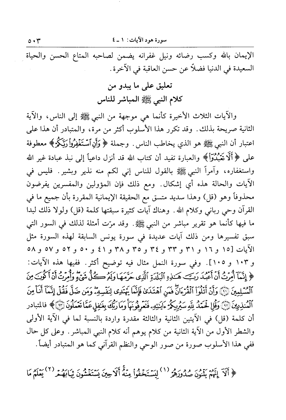 إِنَّما أُمِرْتُ أَنْ أَعْبُدَ رَبَّ هذِهِ الْبَلْدَةِ الَّذِي حَرَّمَها وَلَهُ كُلُّ شَيْءٍ وَأُمِرْتُ أَنْ أَكُونَ مِنَ الْمُسْلِمِينَ (91) وَأَنْ أَتْلُوَا الْقُرْآنَ فَمَنِ اهْتَدى فَإِنَّما يَهْتَدِي لِنَفْسِهِ وَمَنْ ضَلَّ فَقُلْ إِنَّما أَنَا مِنَ الْمُنْذِرِينَ (92) وَقُلِ الْحَمْدُ لِلَّهِ سَيُرِيكُمْ آياتِهِ فَتَعْرِفُونَها وَما رَبُّكَ بِغافِلٍ عَمَّا تَعْمَلُونَ (93) فالمتبادر أن كلمة (قل) في الآيتين الثانية والثالثة مقدرة واردة بالنسبة لما في الآية الأولى والشطر الأول من الآية الثانية من كلام يوهم أنه كلام النبي المباشر. وعلى كل حال ففي هذا الأسلوب صورة من صور الوحي والنظم القرآني كما هو المتبادر أيضا.