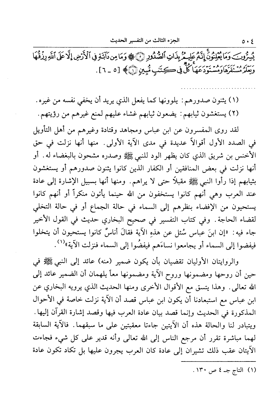 لقد روى المفسرون عن ابن عباس ومجاهد وقتادة وغيرهم من أهل التأويل في الصدد الأول أقوالا عديدة في مدى الآية الأولى. منها أنها نزلت في حق الأخنس بن شريق الذي كان يظهر الود للنبي صلى الله عليه وسلم وصدره مشحون بالبغضاء له. أو أنها نزلت في بعض المنافقين أو الكفار الذين كانوا يثنون صدورهم أو يستغشون بثيابهم إذا رأوا النبي صلى الله عليه وسلم مقبلا حتى لا يراهم. ومنها أنها بسبيل الإشارة إلى عادة عند العرب وهي أنهم كانوا يستخفون من الله حينما يأتون منكرا أو أنهم كانوا يستحيون من الإفضاء بنظرهم إلى السماء فى حالة الجماع أو في حالة التخلي لقضاء الحاجة. وفي كتاب التفسير في صحيح البخاري حديث في القول الأخير جاء فيه: «إن ابن عباس سئل عن هذه الآية فقال أناس كانوا يستحيون أن يتخلوا فيفضوا إلى السماء أو يجامعوا نساءهم فيفضوا إلى السماء فنزلت الآية» «1» .