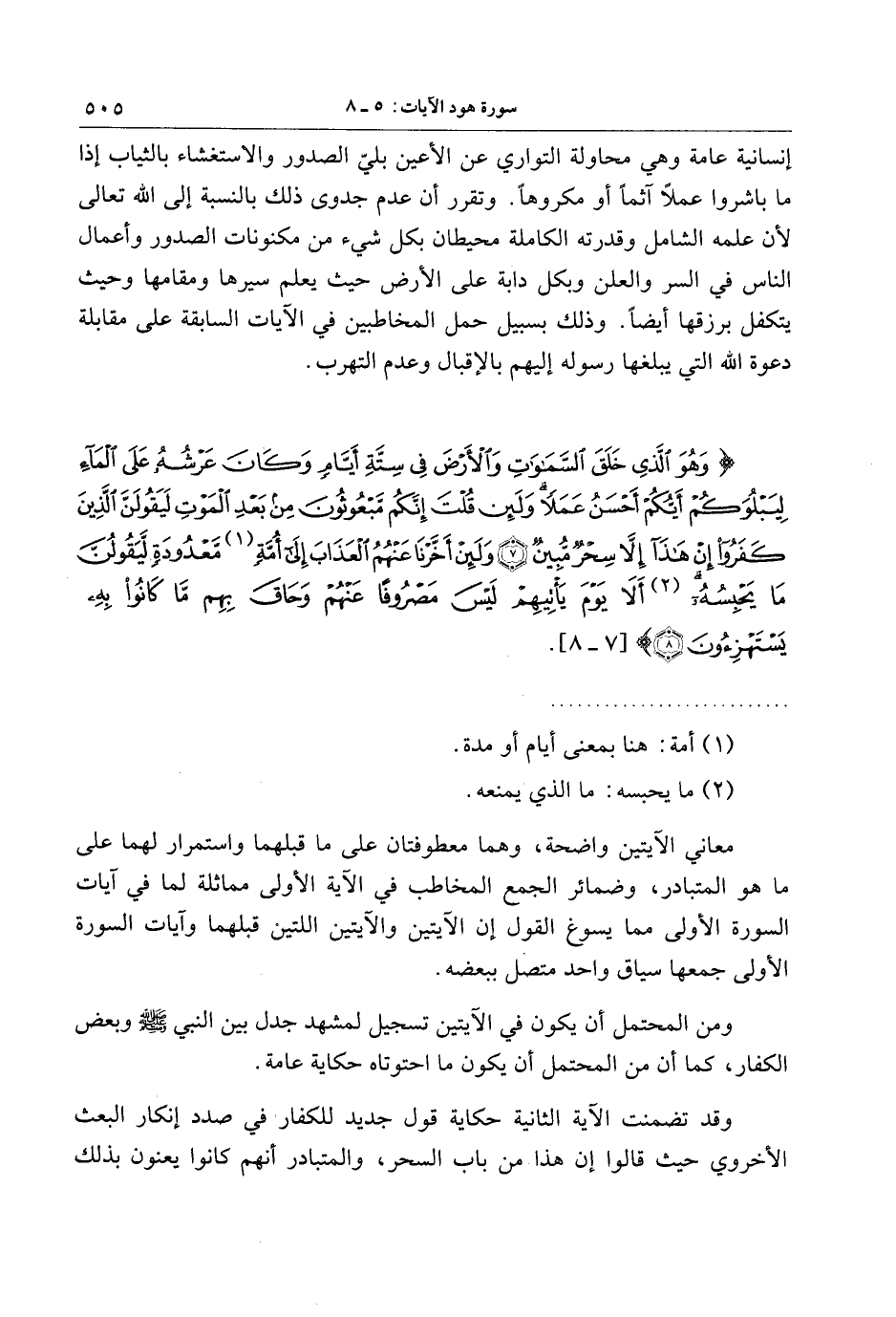 وَهُوَ الَّذِي خَلَقَ السَّماواتِ وَالْأَرْضَ فِي سِتَّةِ أَيَّامٍ وَكانَ عَرْشُهُ عَلَى الْماءِ لِيَبْلُوَكُمْ أَيُّكُمْ أَحْسَنُ عَمَلاً وَلَئِنْ قُلْتَ إِنَّكُمْ مَبْعُوثُونَ مِنْ بَعْدِ الْمَوْتِ لَيَقُولَنَّ الَّذِينَ كَفَرُوا إِنْ هذا إِلاَّ سِحْرٌ مُبِينٌ (7) وَلَئِنْ أَخَّرْنا عَنْهُمُ الْعَذابَ إِلى أُمَّةٍ مَعْدُودَةٍ لَيَقُولُنَّ ما يَحْبِسُهُ أَلا يَوْمَ يَأْتِيهِمْ لَيْسَ مَصْرُوفاً عَنْهُمْ وَحاقَ بِهِمْ ما كانُوا بِهِ يَسْتَهْزِؤُنَ (8)