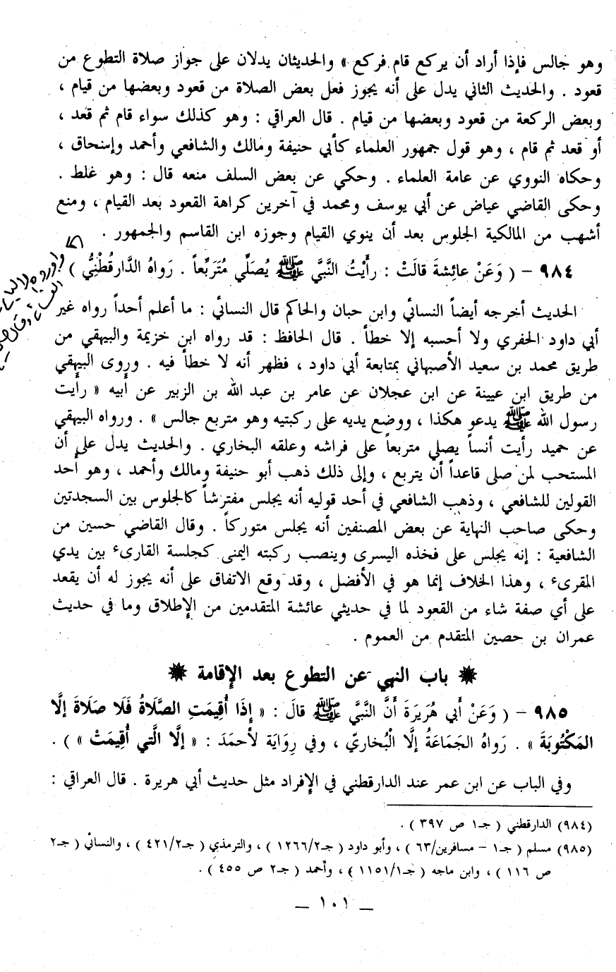 الْحَدِيثُ أَخْرَجَهُ أَيْضًا النَّسَائِيّ وَابْنُ حِبَّانَ وَالْحَاكِمُ قَالَ النَّسَائِيّ: مَا أَعْلَمُ أَحَدًا رَوَاهُ غَيْرَ دَاوُد الْحَفَرِيِّ وَلَا أَحْسَبُهُ إلَّا خَطَأً. قَالَ الْحَافِظُ: قَدْ رَوَاهُ ابْنُ خُزَيْمَةَ وَالْبَيْهَقِيُّ مِنْ طَرِيقِ مُحَمَّدِ بْنِ سَعِيدٍ الْأَصْبَهَانِيِّ بِمُتَابَعَةِ أَبِي دَاوُد، فَظَهَرَ أَنَّهُ لَا خَطَأَ فِيهِ. وَرَوَى الْبَيْهَقِيُّ مِنْ طَرِيقِ ابْنِ عُيَيْنَةَ عَنْ ابْنِ عَجْلَانَ عَنْ عَامِرِ بْنِ عَبْدِ اللَّهِ بْنِ الزُّبَيْرِ عَنْ أَبِيهِ «رَأَيْت رَسُولَ اللَّهِ - صَلَّى اللَّهُ عَلَيْهِ وَسَلَّمَ - يَدْعُو هَكَذَا، وَوَضَعَ يَدَيْهِ عَلَى رُكْبَتَيْهِ وَهُوَ مُتَرَبِّعٌ جَالِسٌ» . وَرَوَاهُ الْبَيْهَقِيُّ عَنْ حُمَيْدٍ رَأَيْت أَنَسًا يُصَلِّي مُتَرَبِّعًا عَلَى فِرَاشِهِ وَعَلَّقَهُ الْبُخَارِيُّ. وَالْحَدِيثُ يَدُلُّ عَلَى أَنَّ الْمُسْتَحَبَّ لِمَنْ صَلَّى قَاعِدًا أَنْ يَتَرَبَّعَ، وَإِلَى ذَلِكَ ذَهَبَ أَبُو حَنِيفَةَ وَمَالِكٌ وَأَحْمَدُ، وَهُوَ أَحَدُ الْقَوْلَيْنِ لِلشَّافِعِيِّ، وَذَهَبَ الشَّافِعِيُّ فِي أَحَدِ قَوْلَيْهِ أَنَّهُ يَجْلِسُ مُفْتَرِشًا كَالْجُلُوسِ بَيْنِ السَّجْدَتَيْنِ وَحَكَى صَاحِبُ النِّهَايَةِ عَنْ بَعْضِ الْمُصَنِّفِينَ أَنَّهُ يَجْلِسُ مُتَوَرِّكًا. وَقَالَ الْقَاضِي حُسَيْنٌ مِنْ الشَّافِعِيَّةِ: إنَّهُ يَجْلِسُ عَلَى فَخِذِهِ الْيُسْرَى وَيَنْصِبُ رُكْبَتَهُ الْيُمْنَى كَجِلْسَةِ الْقَارِئِ بَيْنَ يَدَيْ الْمُقْرِئِ، وَهَذَا الْخِلَافُ إنَّمَا هُوَ فِي الْأَفْضَلِ، وَقَدْ وَقَعَ الِاتِّفَاقُ عَلَى أَنَّهُ يَجُوزُ لَهُ أَنْ يَقْعُدَ عَلَى أَيِّ صِفَةٍ شَاءَ مِنْ الْقُعُودِ لِمَا فِي حَدِيثَيْ عَائِشَةَ الْمُتَقَدِّمَيْنِ مِنْ الْإِطْلَاقِ وَمَا فِي حَدِيثِ عِمْرَانَ بْنِ حُصَيْنٍ الْمُتَقَدِّمِ مِنْ الْعُمُومِ.