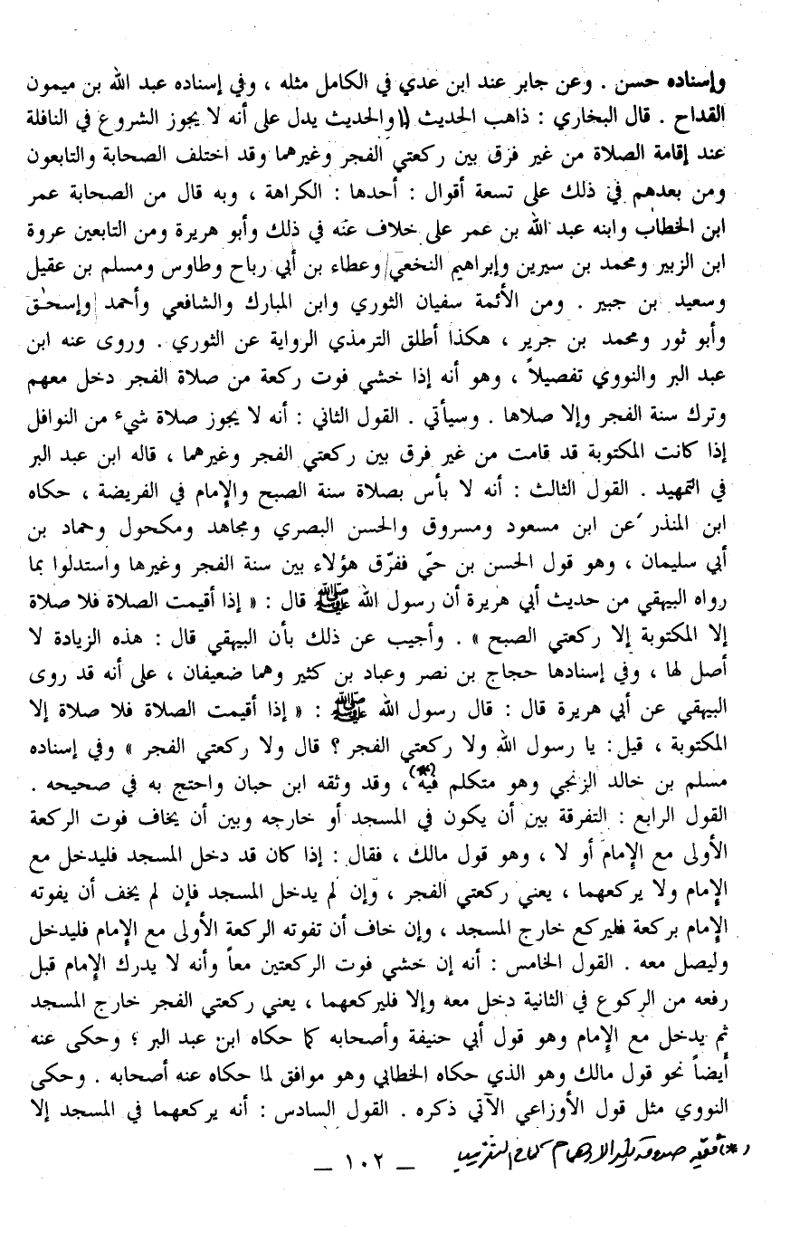 ـــــــــــــــــــــــــــــQوَإِسْنَادُهُ حَسَنٌ. وَعَنْ جَابِرٍ عِنْدَ ابْنِ عَدِيٍّ فِي الْكَامِلِ مِثْلُهُ، وَفِي إسْنَادِهِ عَبْدُ اللَّهِ بْنِ مَيْمُونٍ الْقَدَّاحُ. قَالَ الْبُخَارِيُّ: ذَاهِبُ الْحَدِيثِ. وَالْحَدِيثُ يَدُلّ عَلَى أَنَّهُ لَا يَجُوزُ الشُّرُوعُ فِي النَّافِلَةِ عِنْدَ إقَامَةِ الصَّلَاةِ مِنْ غَيْرِ فَرْقٍ بَيْنَ رَكْعَتَيْ الْفَجْرِ وَغَيْرِهِمَا وَقَدْ اخْتَلَفَ الصَّحَابَةُ وَالتَّابِعُونَ وَمَنْ بَعْدَهُمْ فِي ذَلِكَ عَلَى تِسْعَةِ أَقْوَالٍ: أَحَدُهَا: الْكَرَاهَةُ، وَبِهِ قَالَ مِنْ الصَّحَابَةِ عُمَرُ بْنُ الْخَطَّابِ وَابْنُهُ عَبْدُ اللَّهِ بْنِ عُمَرَ عَلَى خِلَافٍ عَنْهُ فِي ذَلِكَ وَأَبُو هُرَيْرَةَ وَمِنْ التَّابِعِينَ عُرْوَةُ بْنُ الزُّبَيْرِ وَمُحَمَّدُ بْنُ سِيرِينَ وَإِبْرَاهِيمُ النَّخَعِيّ وَعَطَاءُ بْنُ أَبِي رَبَاحٍ وَطَاوُسٌ وَمُسْلِمُ بْنُ عُقَيْلٍ وَسَعِيدُ بْنُ جُبَيْرٍ