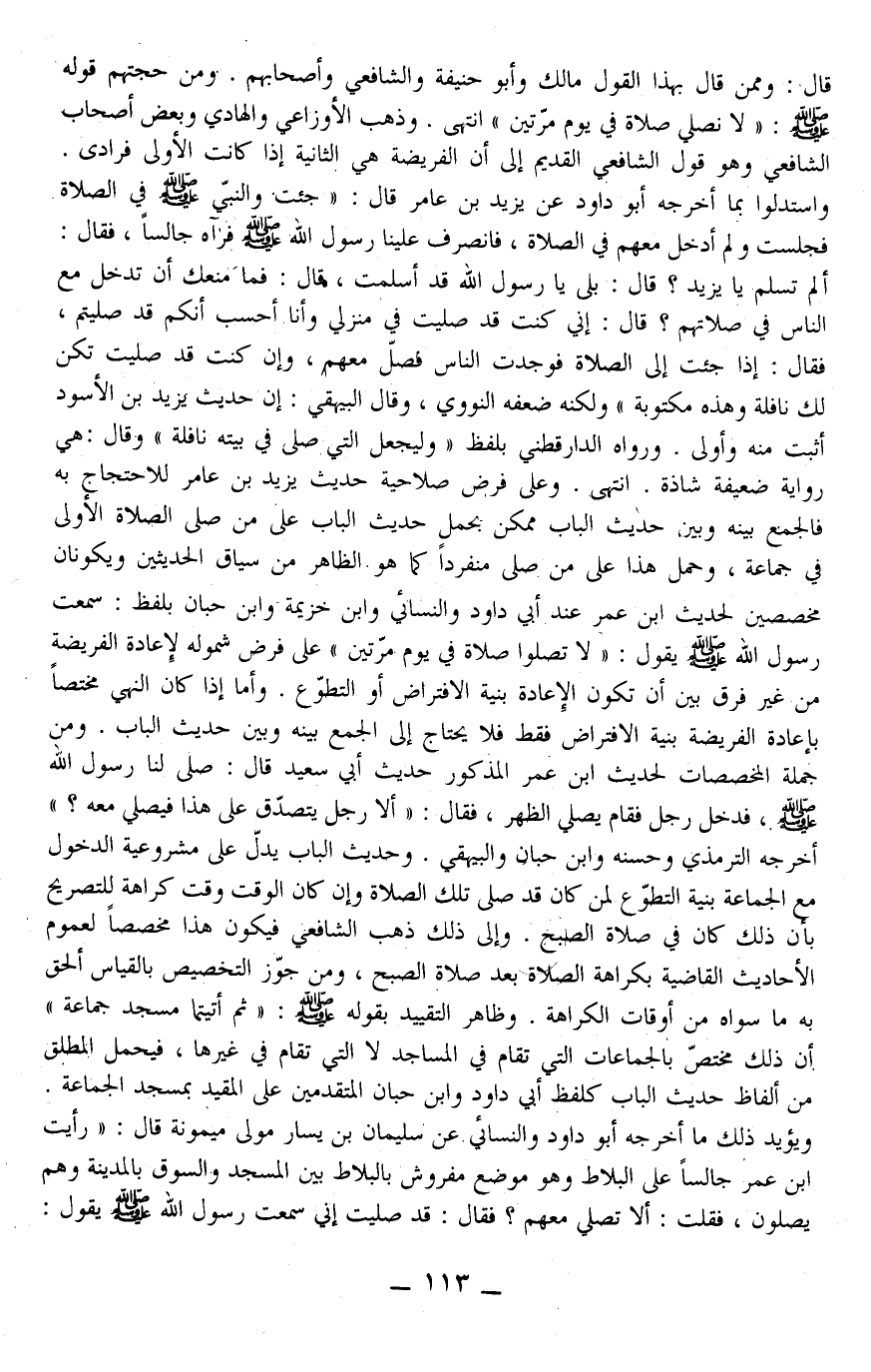 ـــــــــــــــــــــــــــــQقَالَ: وَمِمَّنْ قَالَ بِهَذَا الْقَوْلِ مَالِكٌ وَأَبُو حَنِيفَةَ وَالشَّافِعِيُّ وَأَصْحَابُهُمْ. وَمِنْ حُجَّتِهِمْ قَوْلُهُ - صَلَّى اللَّهُ عَلَيْهِ وَسَلَّمَ -: «لَا نُصَلِّي صَلَاةً فِي يَوْمٍ مَرَّتَيْنِ» انْتَهَى. وَذَهَبَ الْأَوْزَاعِيُّ وَالْهَادِي وَبَعْضُ أَصْحَابِ الشَّافِعِيِّ وَهُوَ قَوْلُ الشَّافِعِيِّ الْقَدِيمِ إلَى أَنَّ الْفَرِيضَةَ الثَّانِيَةَ إذَا كَانَتْ الْأُولَى فُرَادَى.