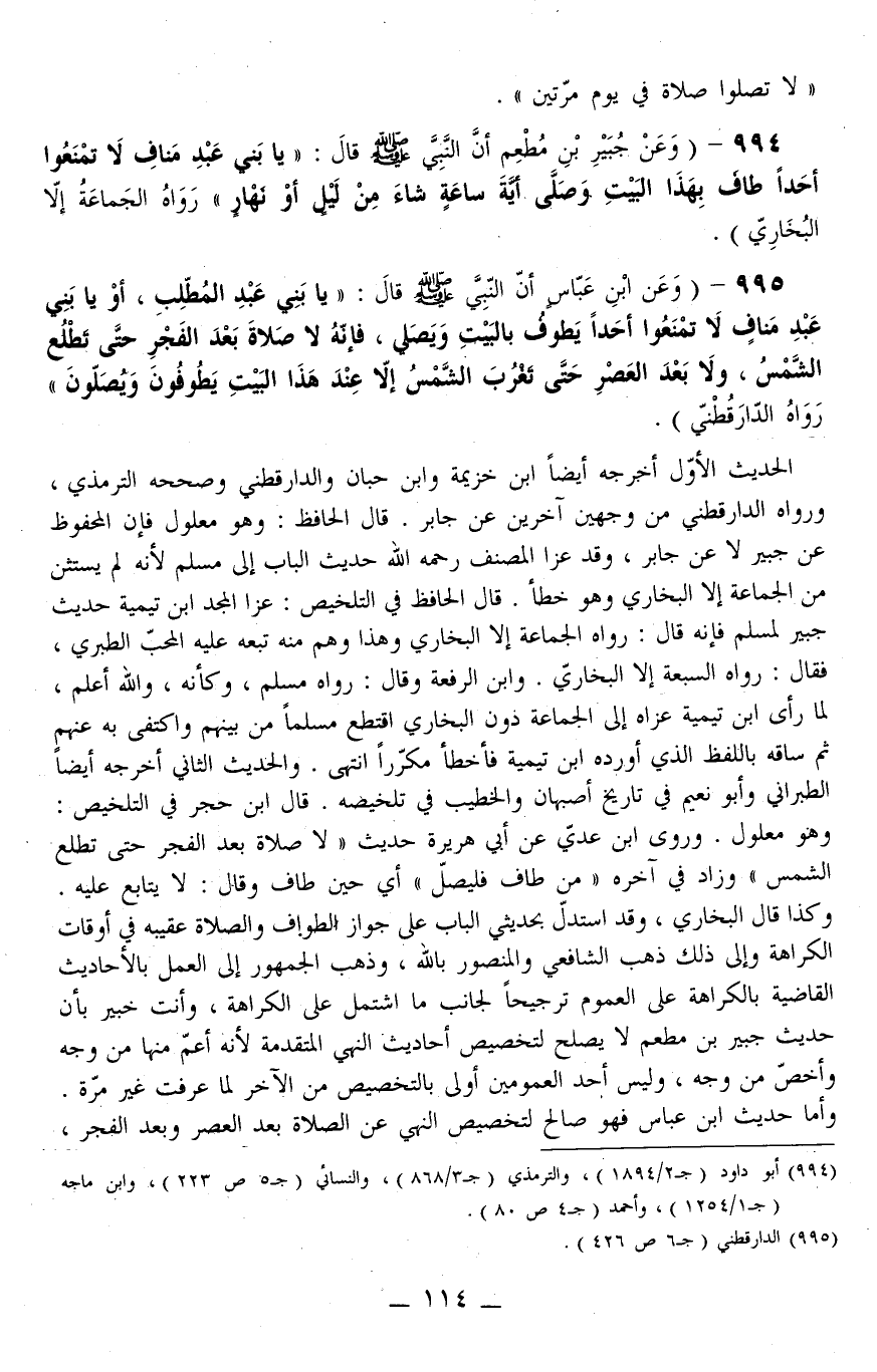 995 - (وَعَنْ ابْنِ عَبَّاسٍ أَنَّ النَّبِيّ - صَلَّى اللَّهُ عَلَيْهِ وَسَلَّمَ - قَالَ: «يَا بَنِي عَبْدِ الْمُطَّلِبِ، أَوْ يَا بَنِي عَبْدَ مَنَافٍ لَا تَمْنَعُوا أَحَدًا يَطُوفُ بِالْبَيْتِ وَيُصَلِّي، فَإِنَّهُ لَا صَلَاةَ بَعْدَ الْفَجْرِ حَتَّى تَطْلُعَ الشَّمْسُ، وَلَا بَعْدَ الْعَصْرِ حَتَّى تَغْرُبَ الشَّمْسُ إلَّا عِنْدَ هَذَا الْبَيْتِ يَطُوفُونَ وَيُصَلُّونَ» رَوَاهُ الدَّارَقُطْنِيّ) .