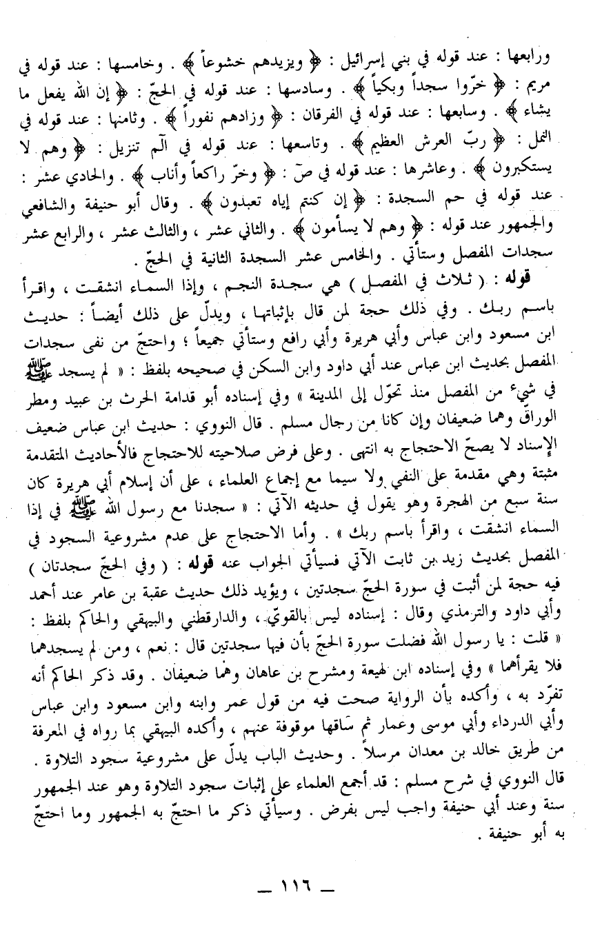 وَأَمَّا الِاحْتِجَاجُ عَلَى عَدَمِ مَشْرُوعِيَّةِ السُّجُودِ فِي الْمُفَصَّلِ بِحَدِيثِ زَيْدِ بْنِ ثَابِتٍ الْآتِي فَسَيَأْتِي الْجَوَابُ عَنْهُ قَوْلُهُ: (وَفِي الْحَجِّ سَجْدَتَانِ) فِيهِ حُجَّة لِمَنْ أَثْبَتَ فِي سُورَةِ الْحَجِّ سَجْدَتَيْنِ، وَيُؤَيِّدُ ذَلِكَ حَدِيثُ عُقْبَةَ بْنِ عَامِرٍ عِنْدَ أَحْمَدَ وَأَبِي دَاوُد وَالتِّرْمِذِيُّ وَقَالَ: إسْنَادُهُ لَيْسَ بِالْقَوِيِّ، وَالدَّارَقُطْنِيّ وَالْبَيْهَقِيُّ وَالْحَاكِم بِلَفْظِ: «قُلْت: يَا رَسُولَ اللَّهِ فُضِّلَتْ سُورَةُ الْحَجِّ بِأَنَّ فِيهَا سَجْدَتَيْنِ قَالَ: نَعَمْ، وَمَنْ لَمْ يَسْجُدْهُمَا فَلَا يَقْرَأهُمَا» وَفِي إسْنَادِهِ ابْنُ لَهِيعَةَ وَمِشْرَحُ بْنُ هَاعَانَ ضَعِيفَانِ. وَقَدْ ذَكَرَ الْحَاكِمُ أَنَّهُ تَفَرَّدَ بِهِ، وَأَكَّدَهُ بِأَنَّ الرِّوَايَةَ صَحَّتْ فِيهِ مِنْ قَوْلِ عُمَرَ وَابْنِهِ وَابْنِ مَسْعُودٍ وَابْنِ عَبَّاسٍ وَأَبِي الدَّرْدَاءَ وَأَبِي مُوسَى وَعَمَّارٍ ثُمَّ سَاقَهَا مَوْقُوفَةً عَنْهُمْ، وَأَكَّدَهُ الْبَيْهَقِيُّ بِمَا رَوَاهُ فِي الْمَعْرِفَةِ مِنْ طَرِيقِ خَالِدِ بْنِ مَعْدَانُ مُرْسَلًا وَحَدِيثُ الْبَابِ يَدُلّ عَلَى مَشْرُوعِيَّةِ سُجُودِ التِّلَاوَةِ. قَالَ النَّوَوِيُّ فِي شَرْحِ مُسْلِم: قَدْ أَجْمَعَ الْعُلَمَاءُ عَلَى إثْبَاتِ سُجُودِ التِّلَاوَة وَهُوَ عِنْدَ الْجُمْهُورِ سُنَّةٌ وَعِنْدَ أَبِي حَنِيفَةَ وَاجِبٌ لَيْسَ بِفَرْضٍ.